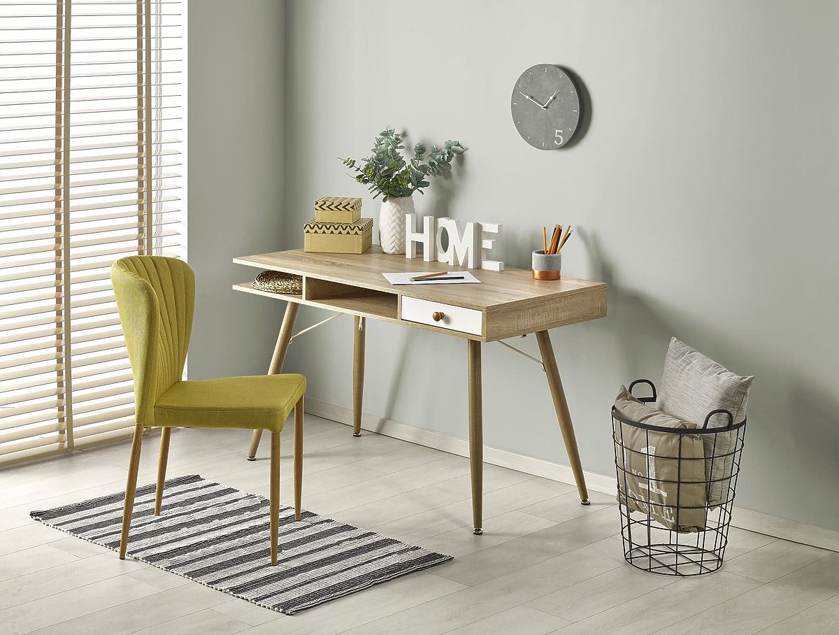 The work surface and legs of the desk are made from laminated MDF board in sonoma oak and white colors. The desk is reinforced with powder-coated steel.
