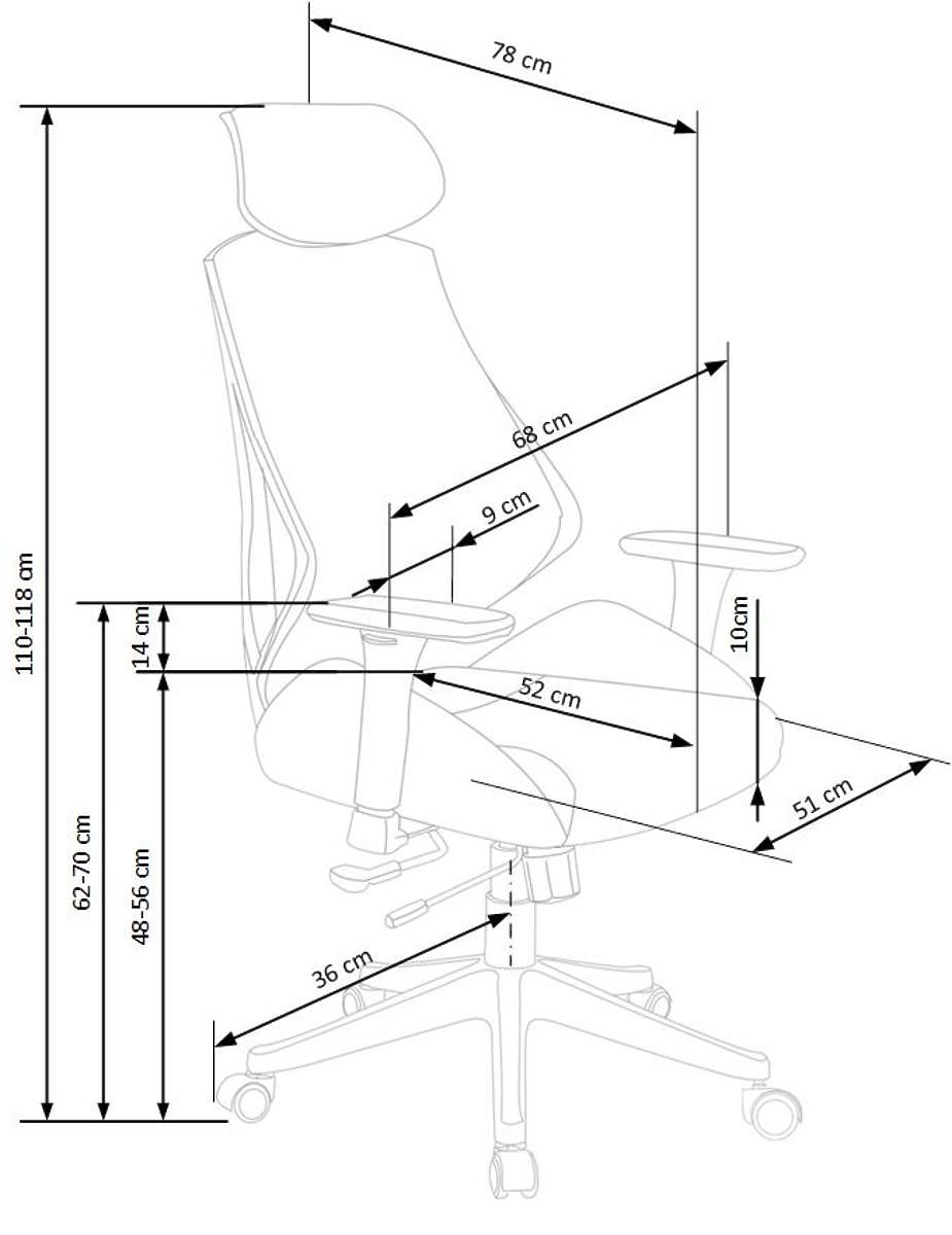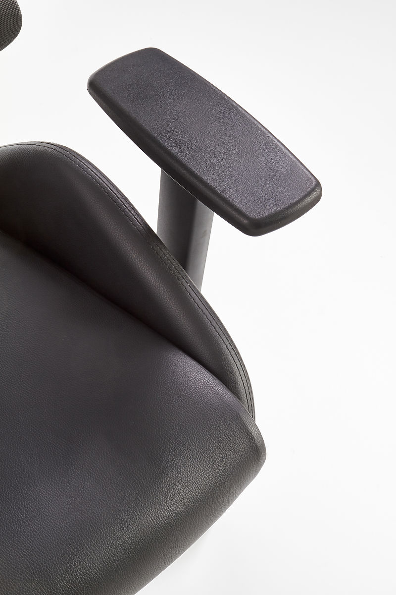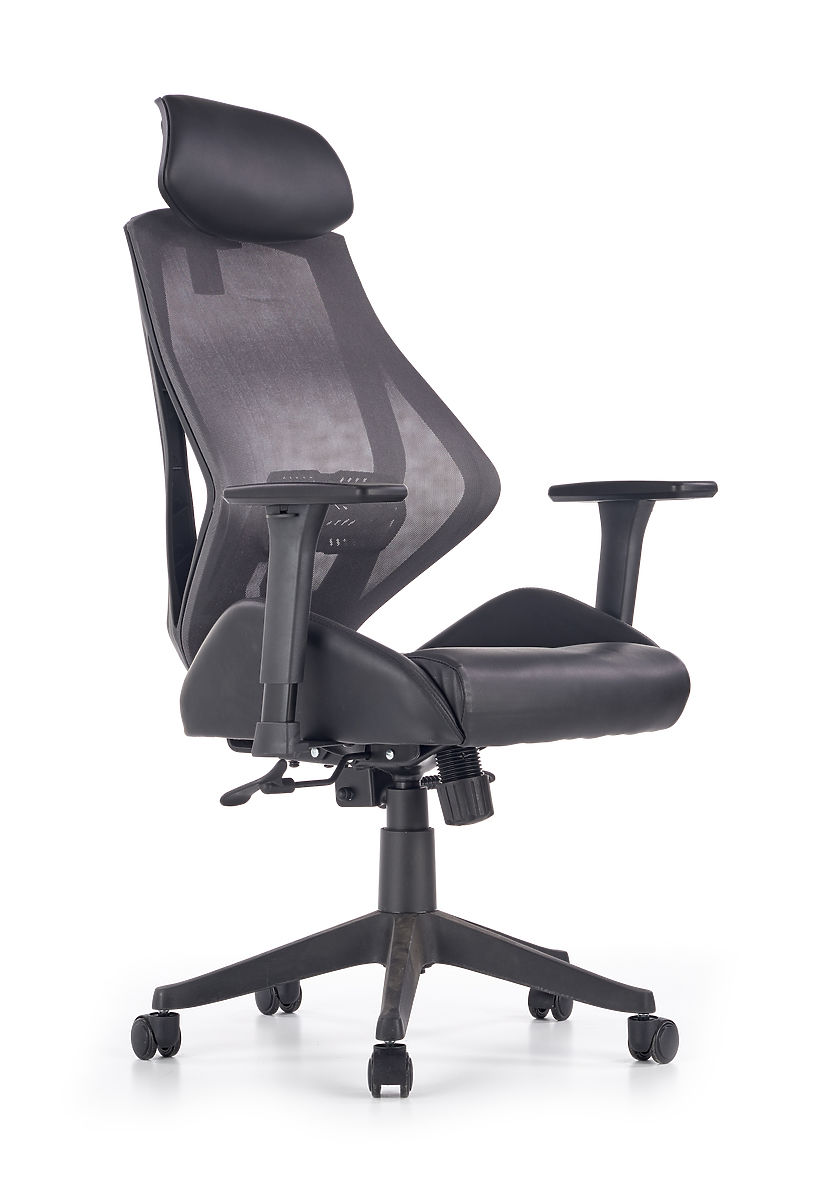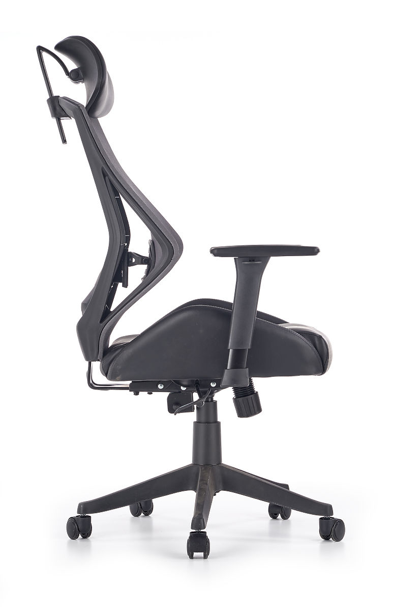 The Multiblock mechanism offers a rocking feature, with adjustable tension. The ergonomically shaped backrest and headrest are covered with breathable mesh, and the seat is upholstered in black eco-leather. The backrest also includes a lumbar support for healthy seating, along with adjustable armrests. The frame is made of sturdy plastic.