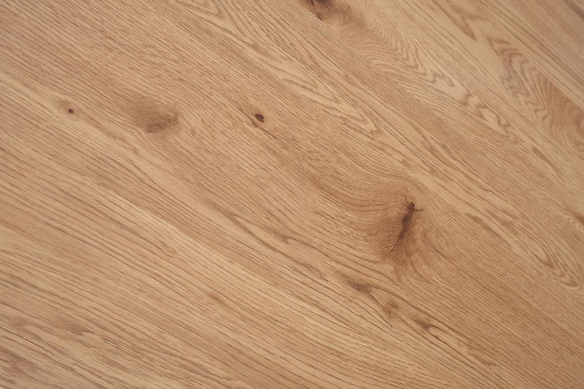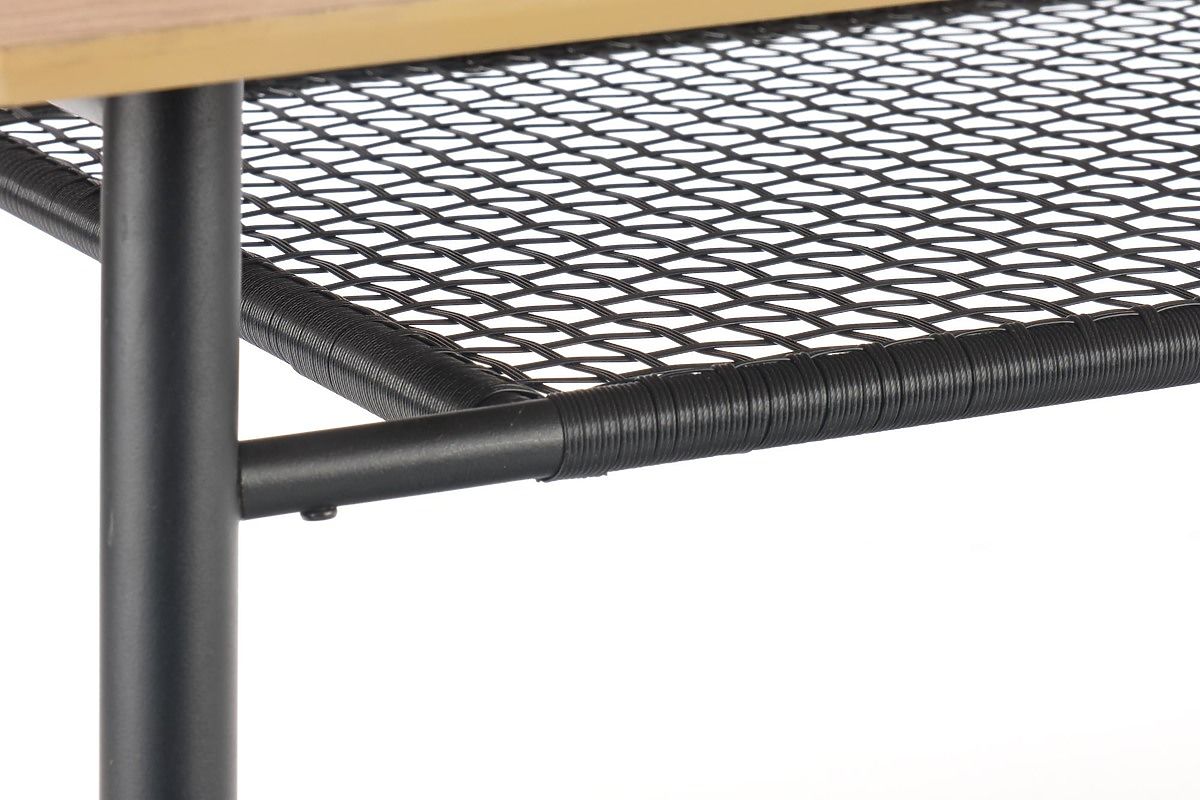 The tabletop is made of laminated MDF board in a golden oak color. The table's frame is made of powder-coated steel in black.
