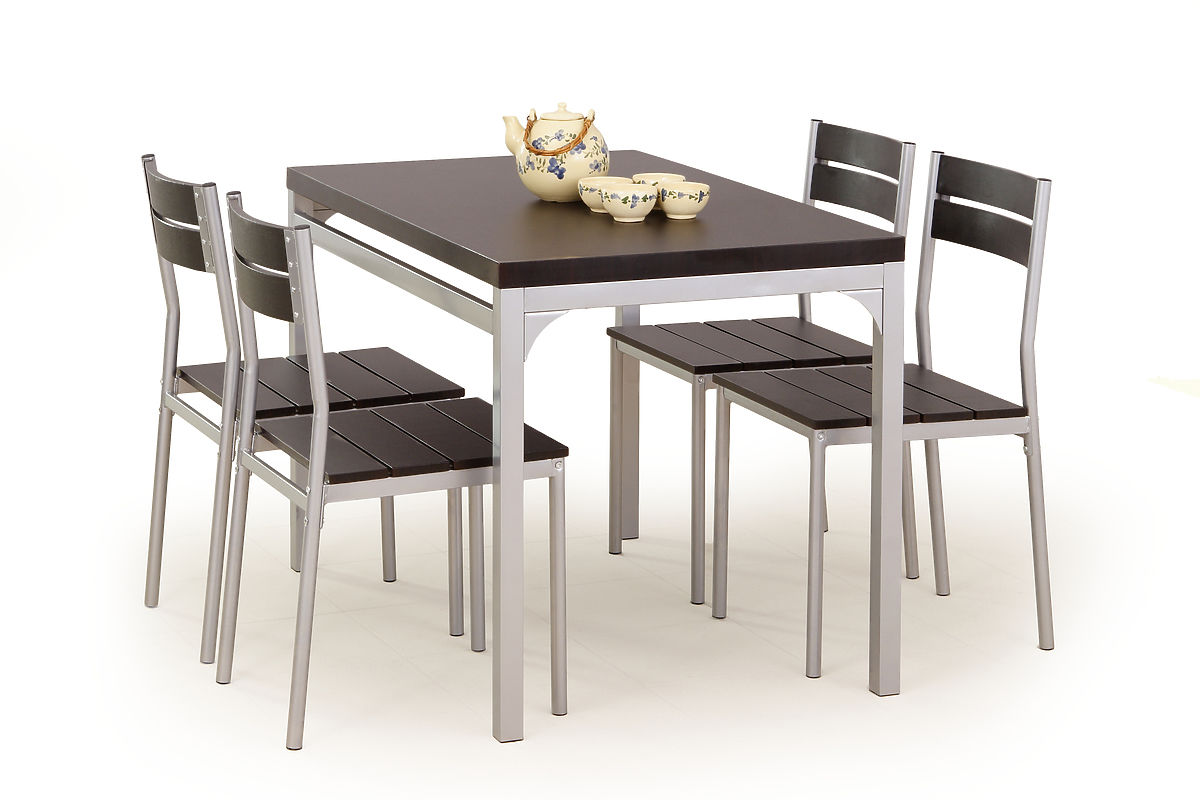 The tabletop and chair seats are made of laminated MDF board in wenge color. The structure of the table and chairs is made of powder-coated steel.