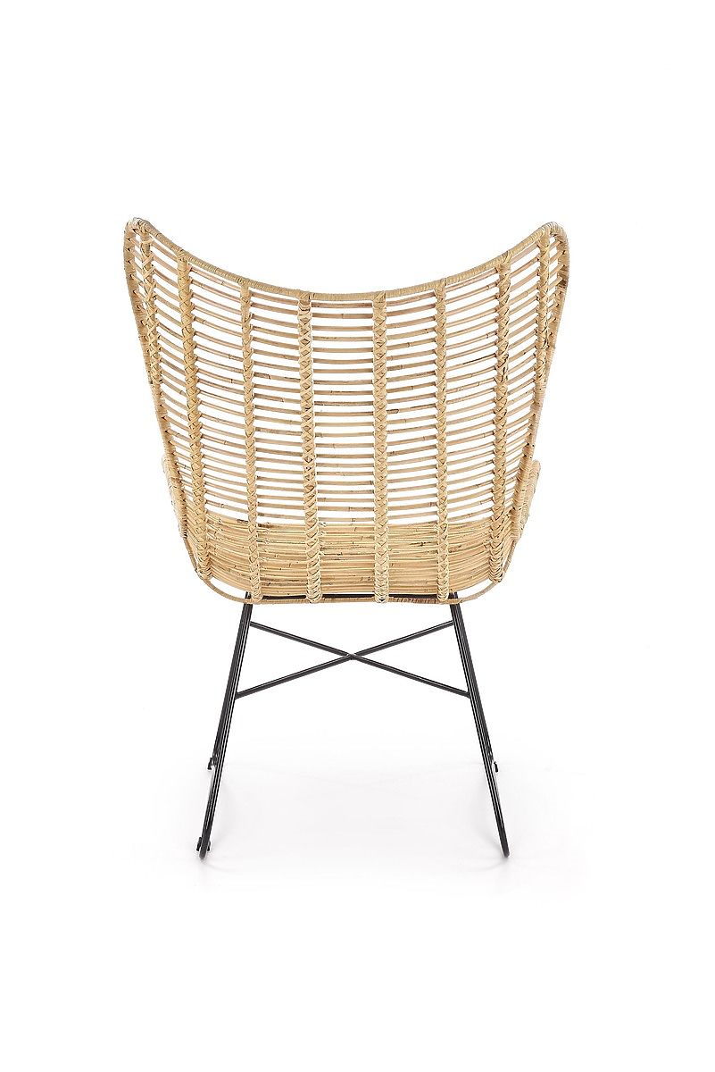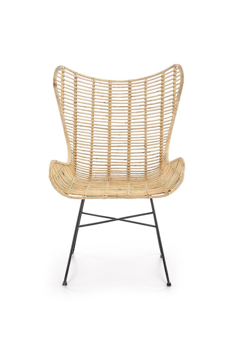 The seat and backrest are woven with natural rattan. The frame is made of powder-coated black steel.