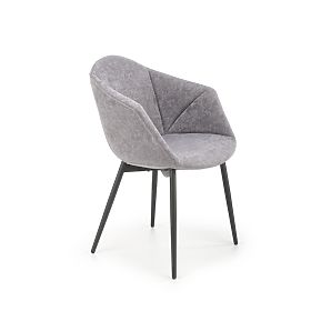 The seat and backrest are upholstered in a pleasant grey fabric. The frame is made of black powder-coated steel.
