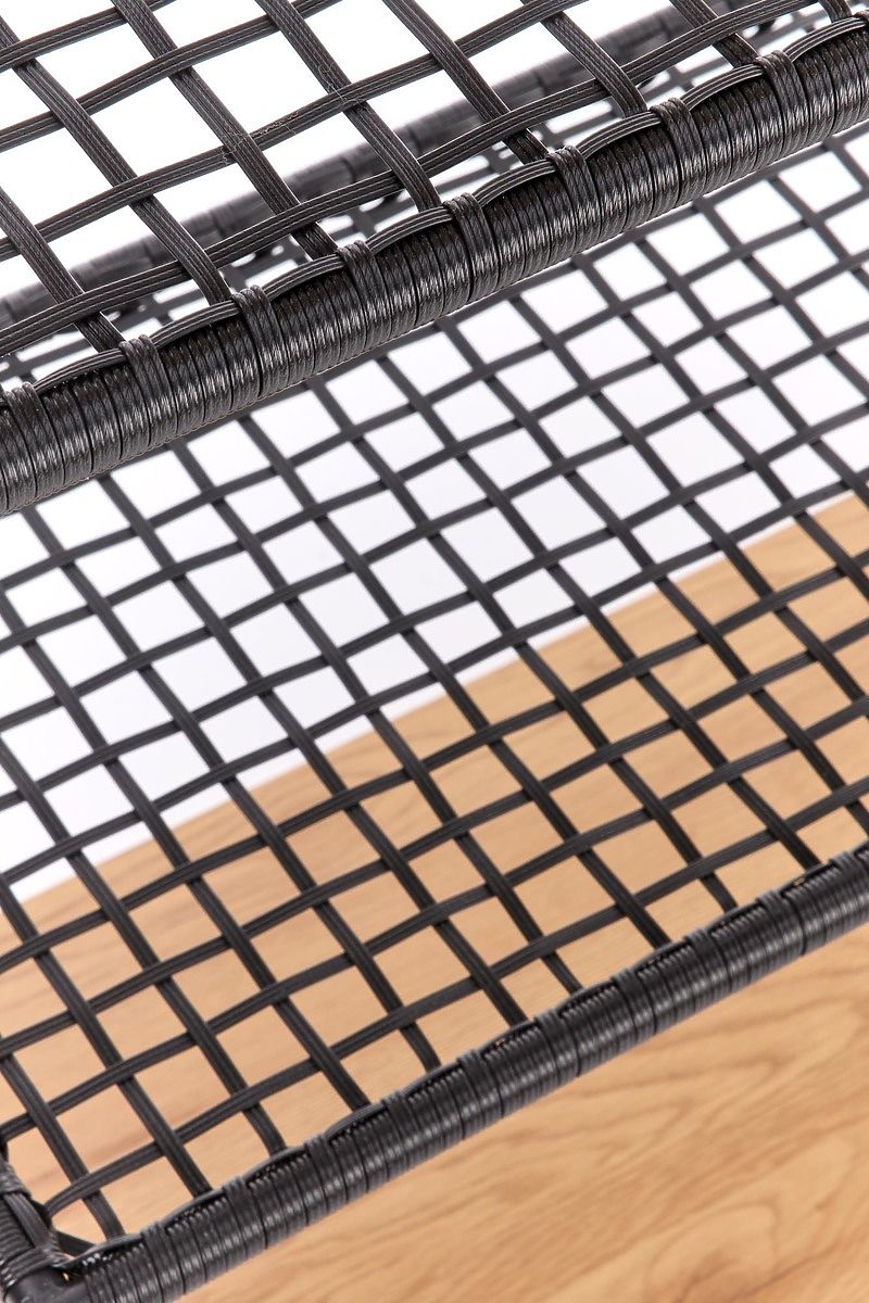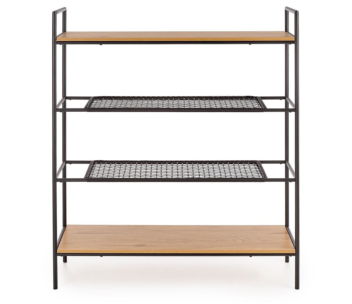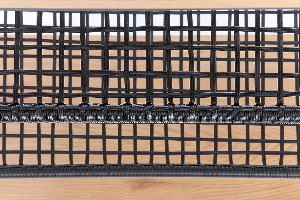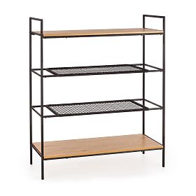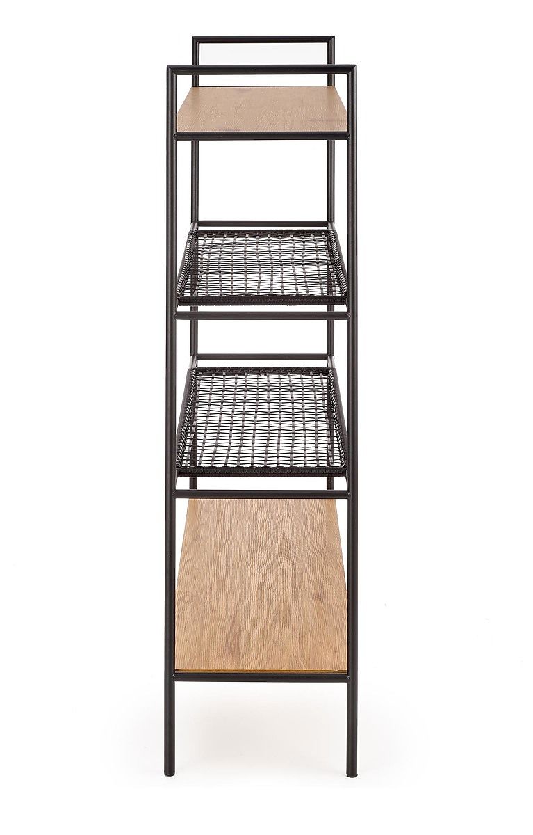 The shelves are made of laminated MDF board in golden oak color and synthetic rattan. The frame is made of black powder-coated steel.