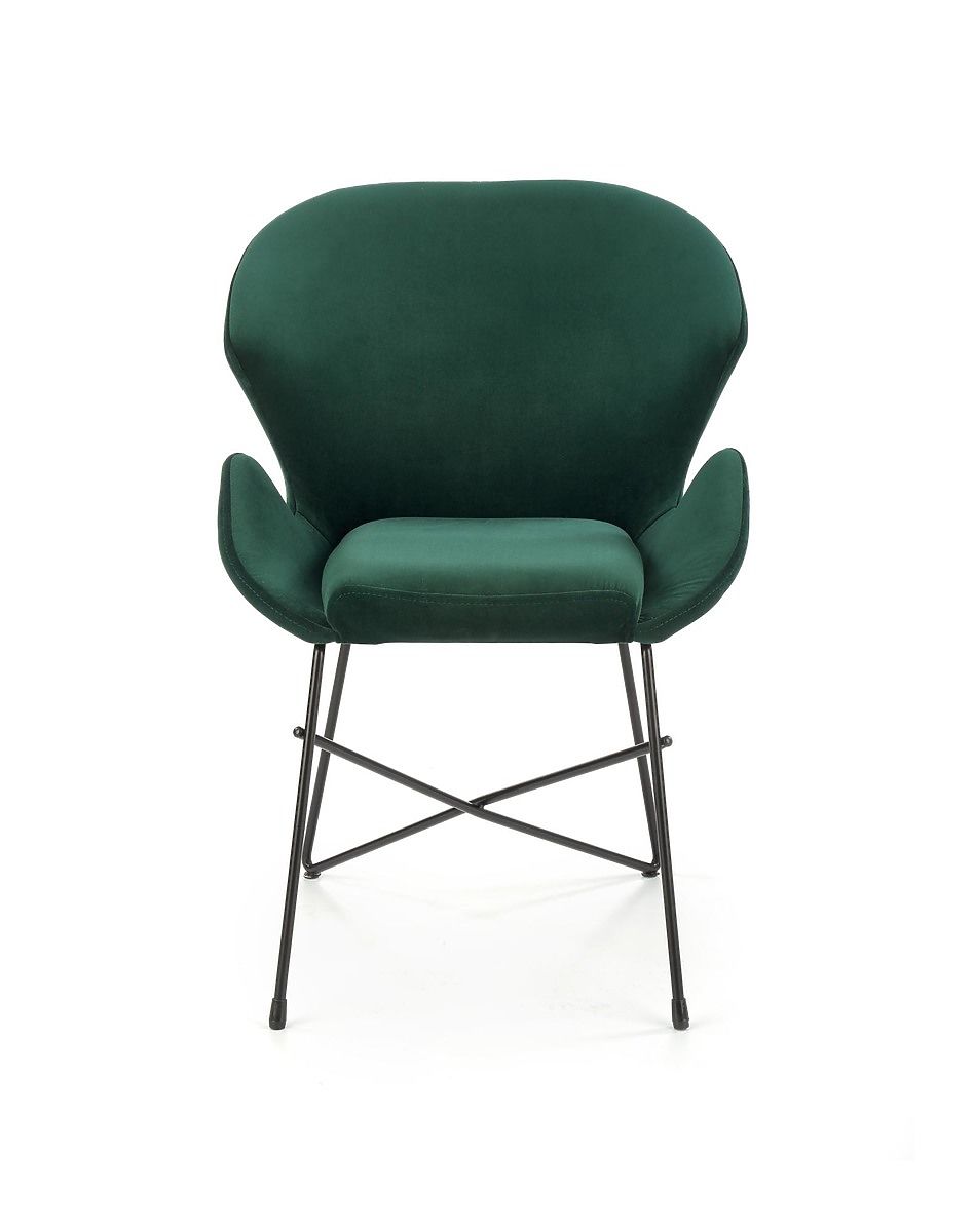 The chair is upholstered in dark green velvet fabric. The frame is made of black powder-coated steel.