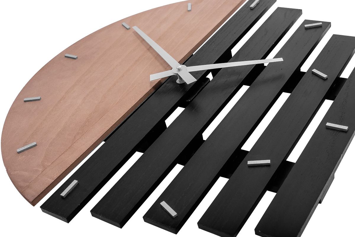 Stylish wall clock with an unconventional design is a perfect accessory that immediately catches the eye and adds a unique character to your interior. The clock combines natural wooden material with a sophisticated black color look. With its unusual shape, it will become the centerpiece of any room where you place it.