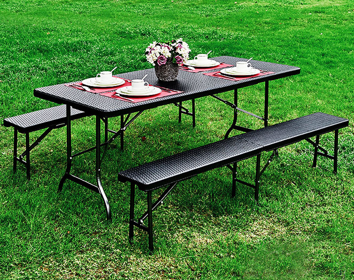 Rattan-patterned catering set for 8 people with foldable table and benches. .. more