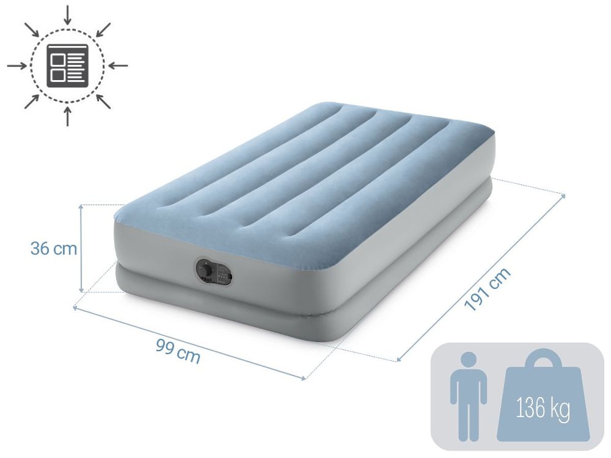 Inflatable mattress INTEX 64157 is the perfect solution in any situation – it serves excellently as a temporary bed for guests, a comfortable sleeping place while traveling, and also as a cozy bed for camping or in a summer house. Thanks to its large dimensions and sturdy construction, it provides high sleep comfort for one adult, without the risk of sagging or air loss. Quick inflation and compact storage make this mattress a practical and versatile choice for anyone who values comfort and mobility.