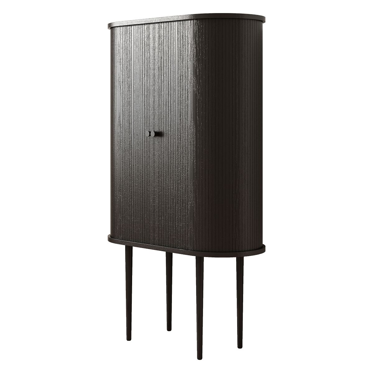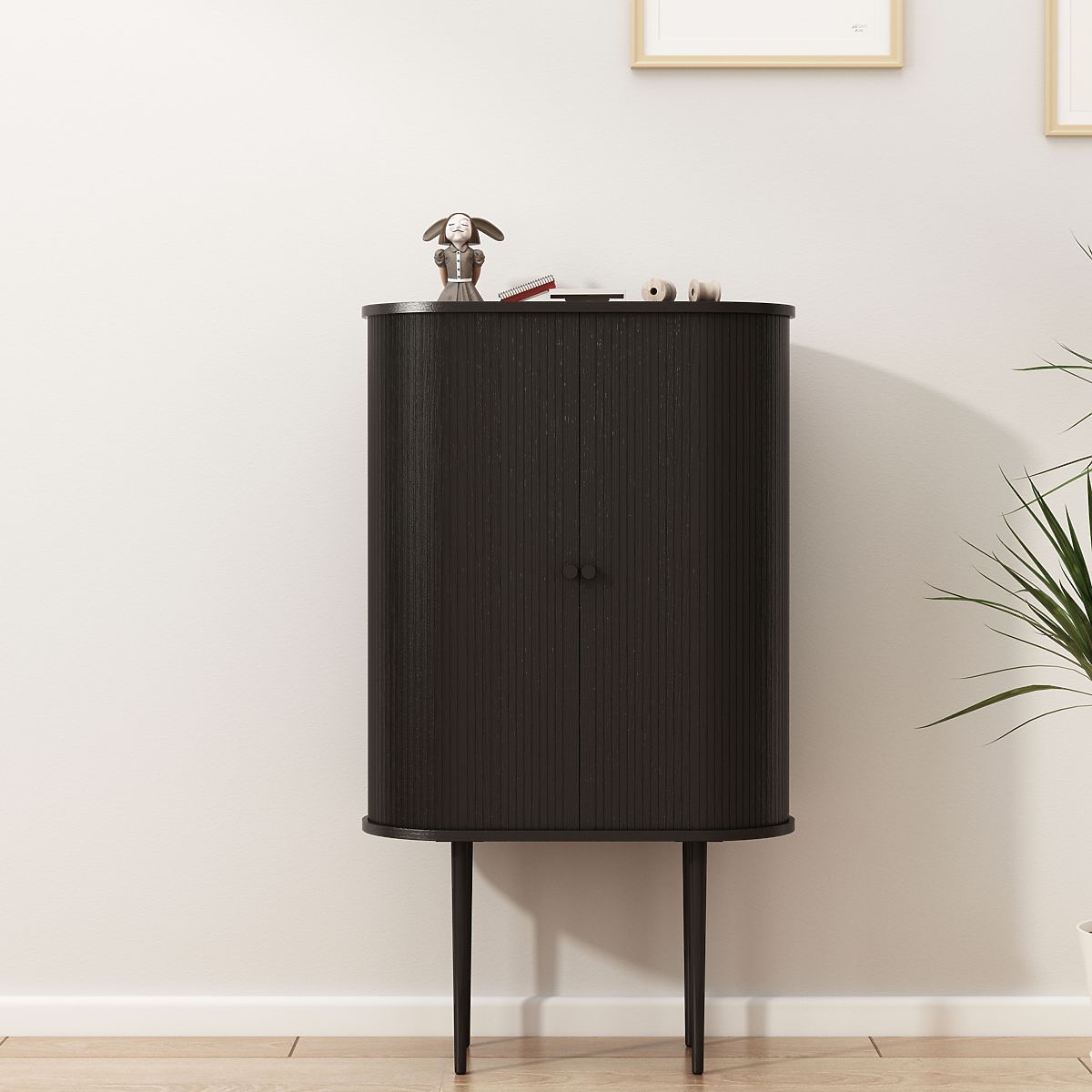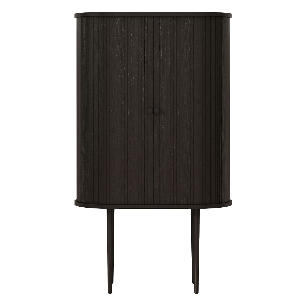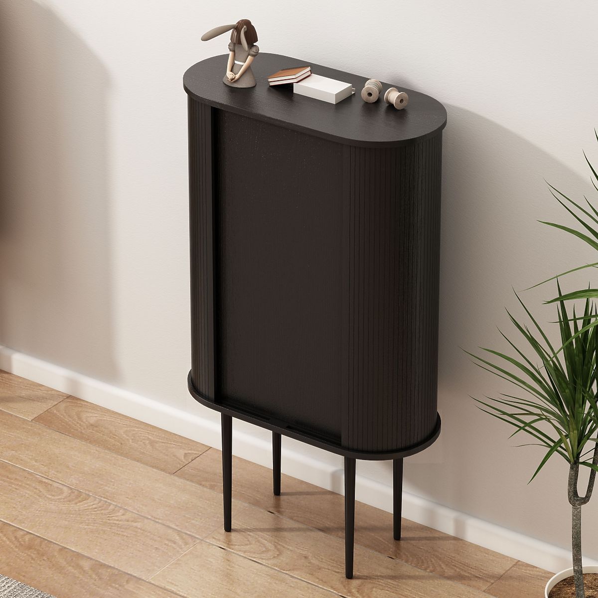 Stylish black dresser with decorative slats and oak sliding doors. .. more
