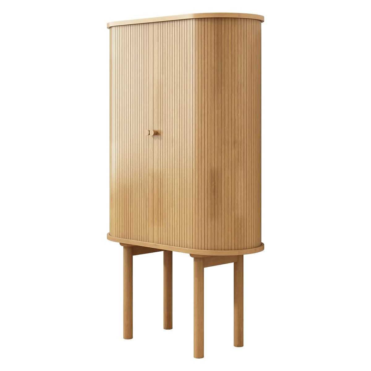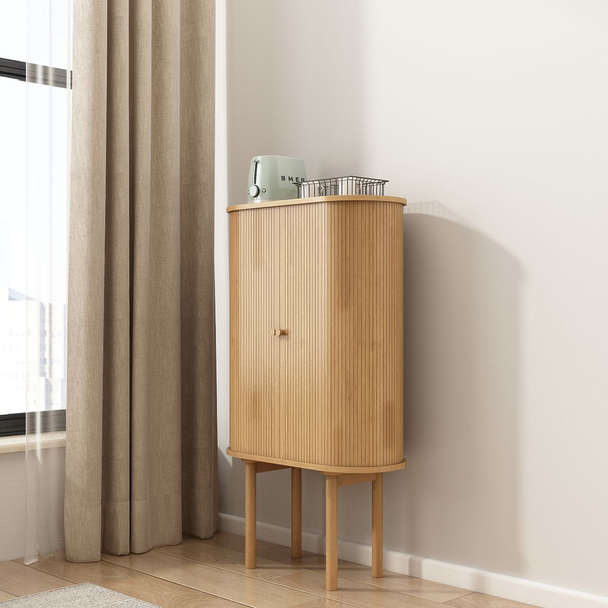 Stylish dresser with sliding oak doors and decorative slats. .. more