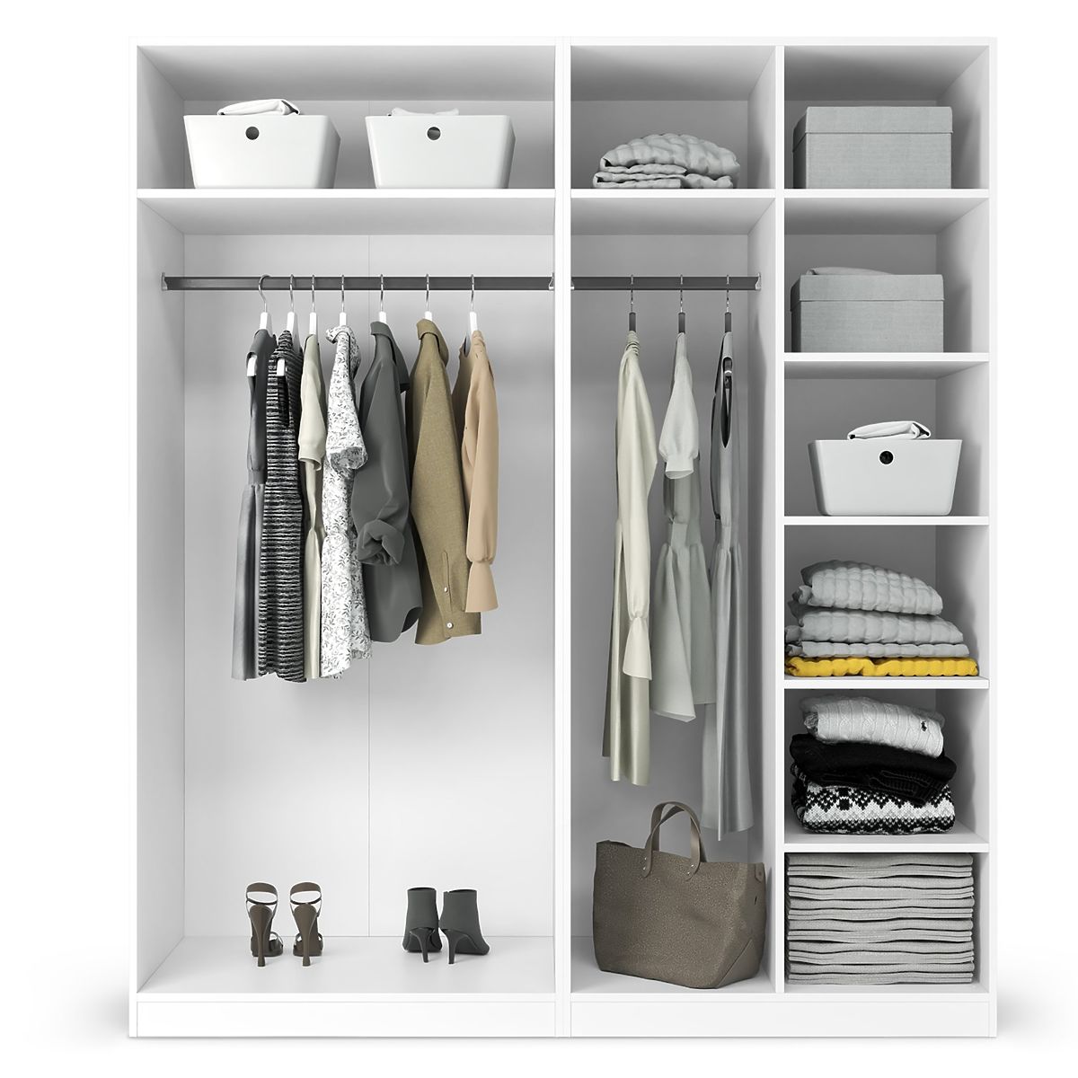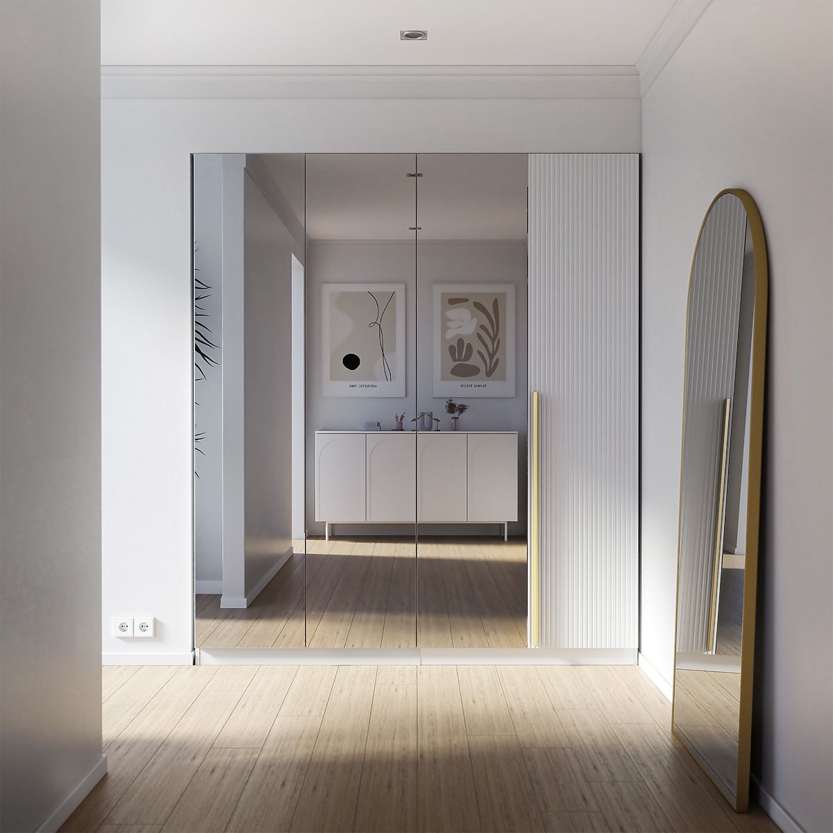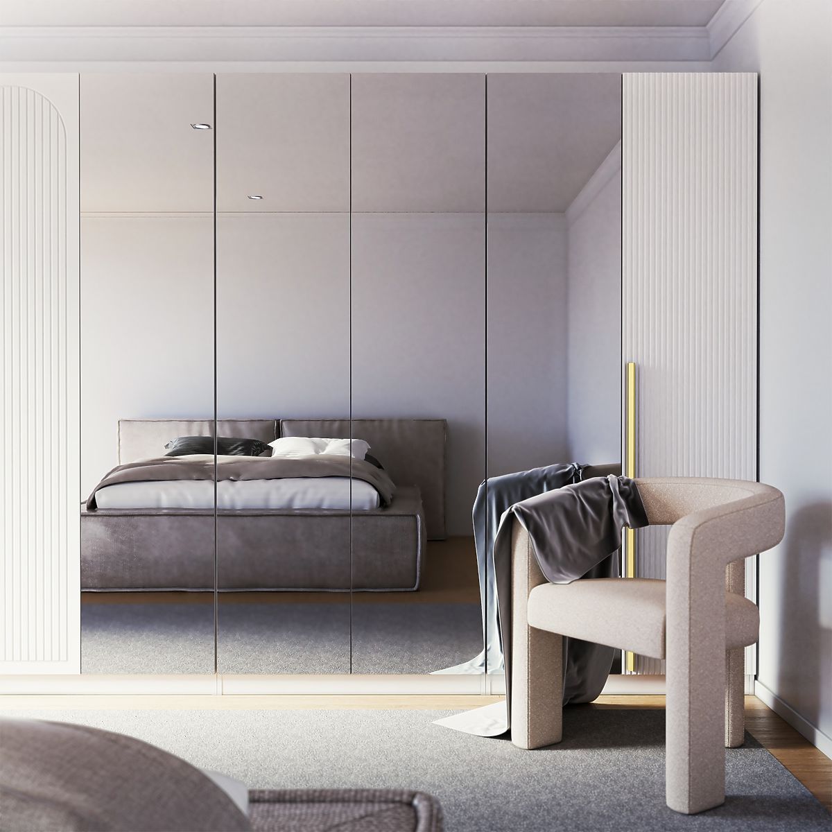 Customizable four-door wardrobe with mirror and decorative grooves. .. more