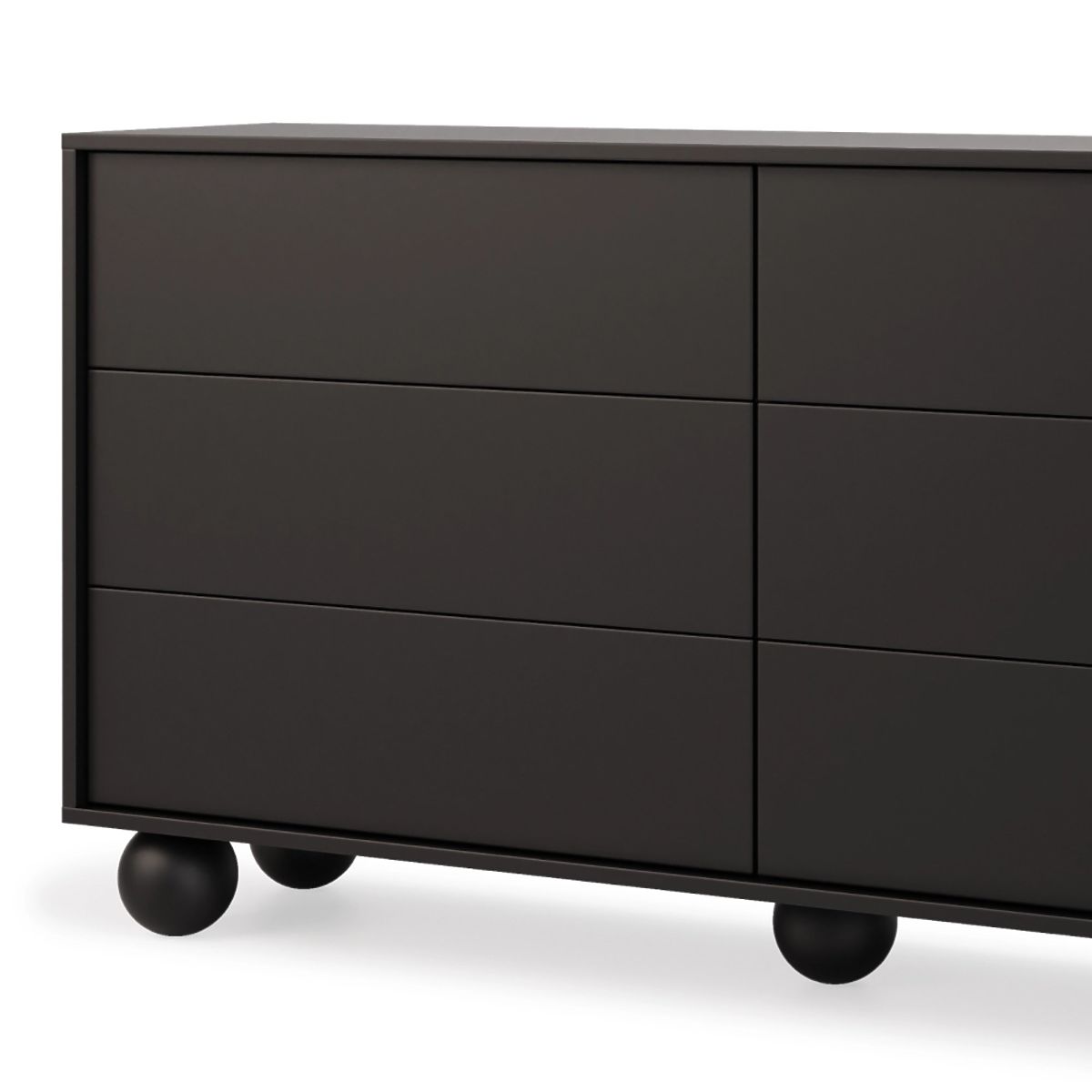 Elegant black dresser with six spacious drawers and ball-shaped legs. .. more