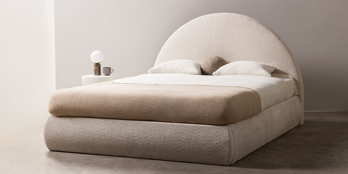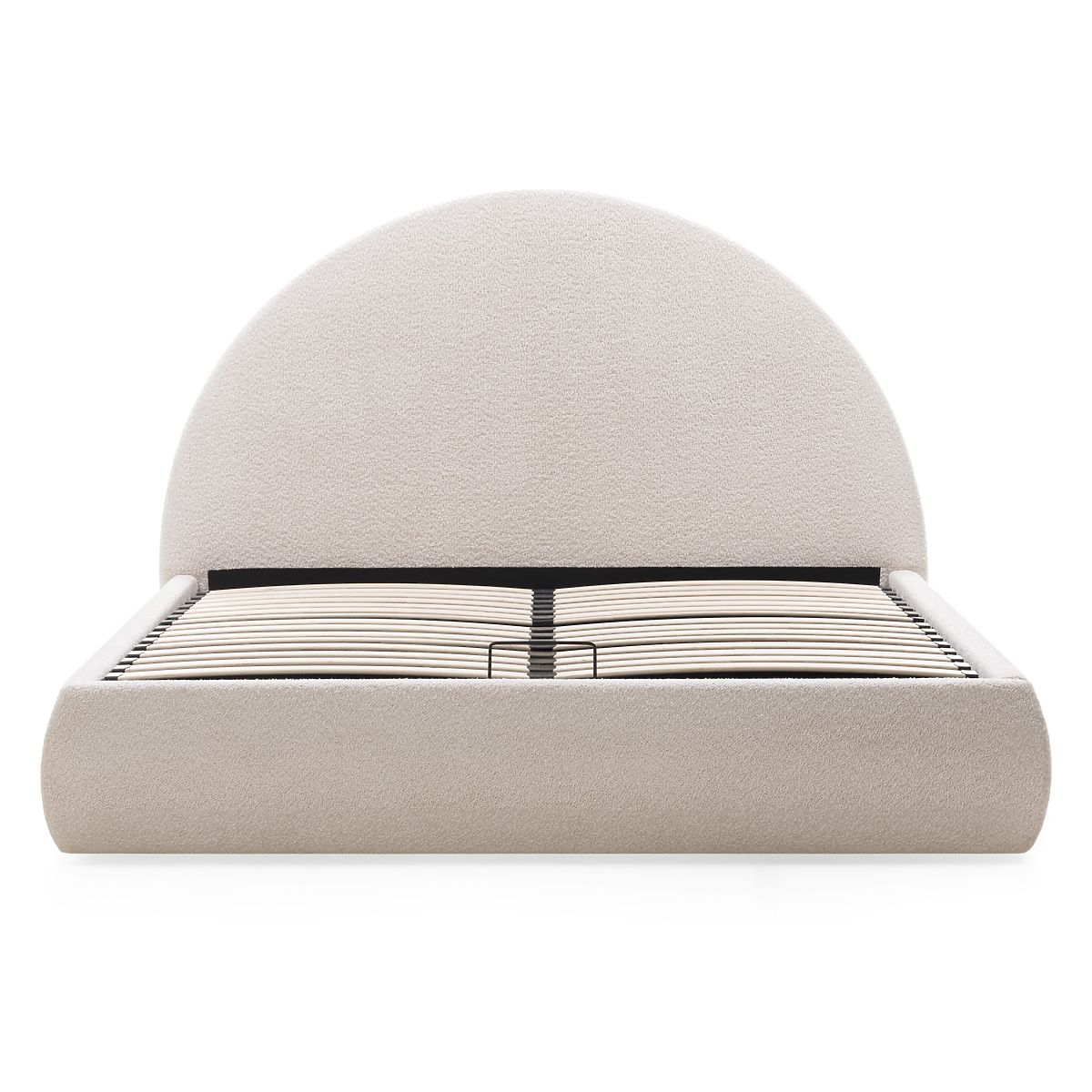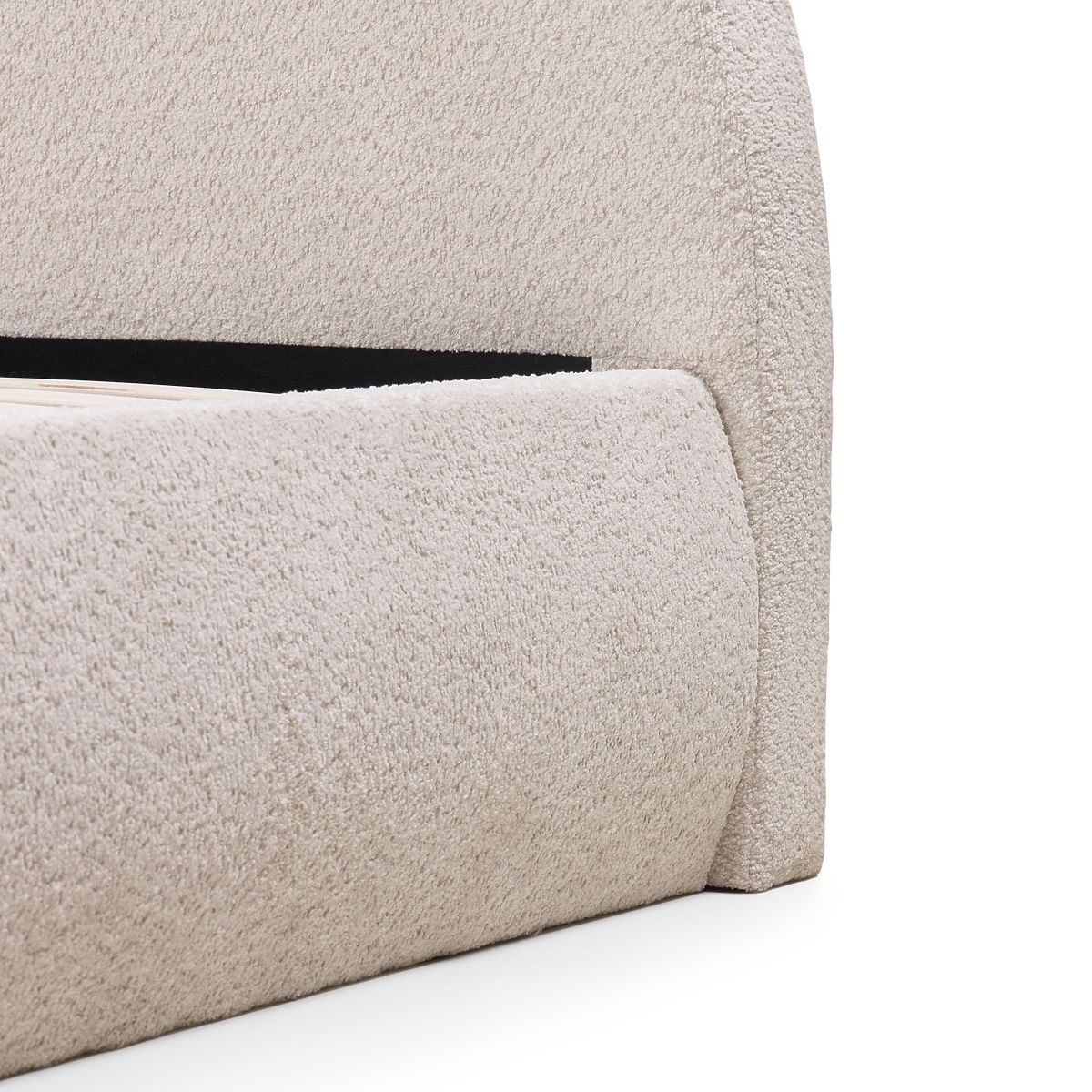 Elegant beige bed with rounded headboard and practical storage. .. more