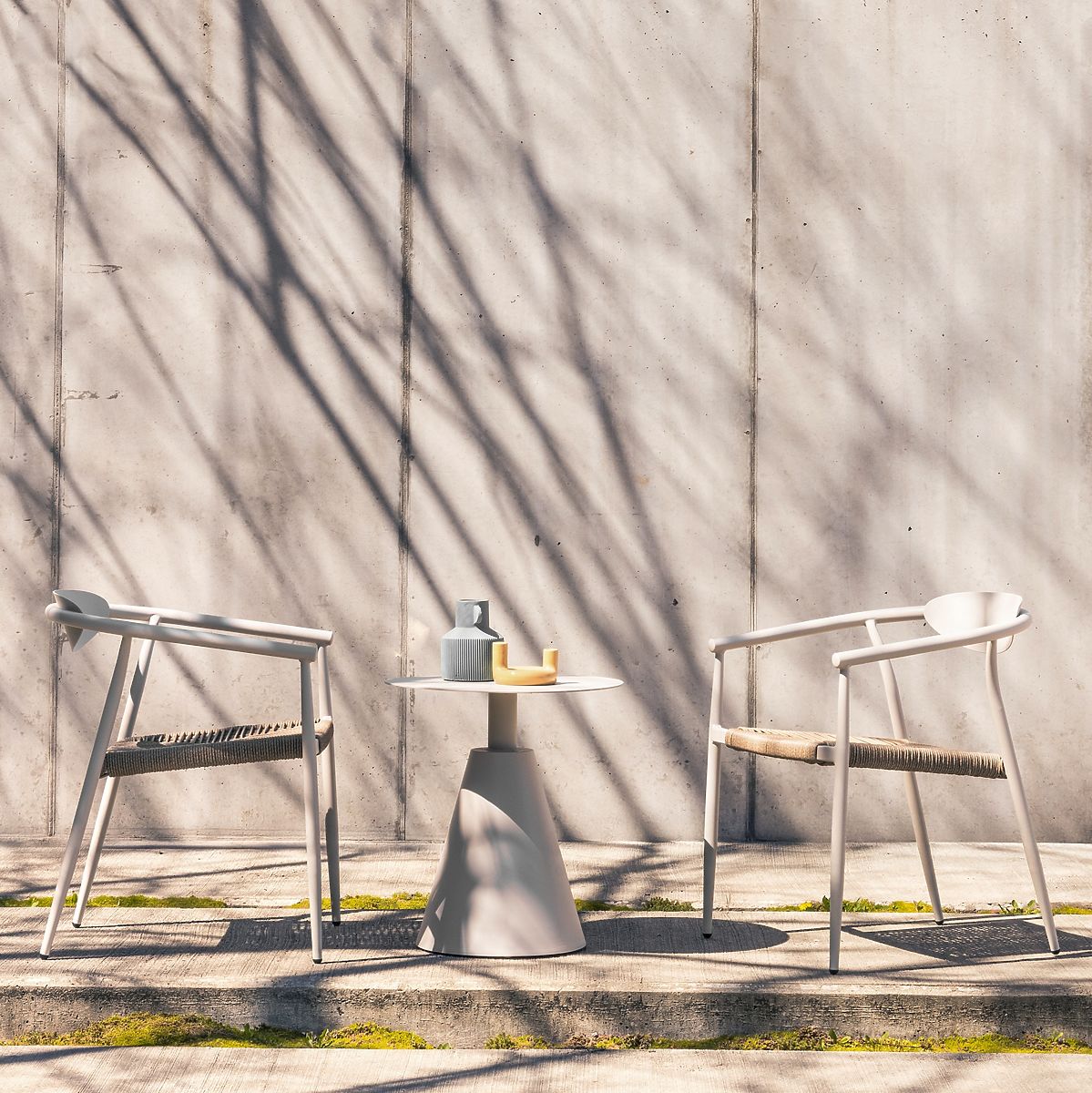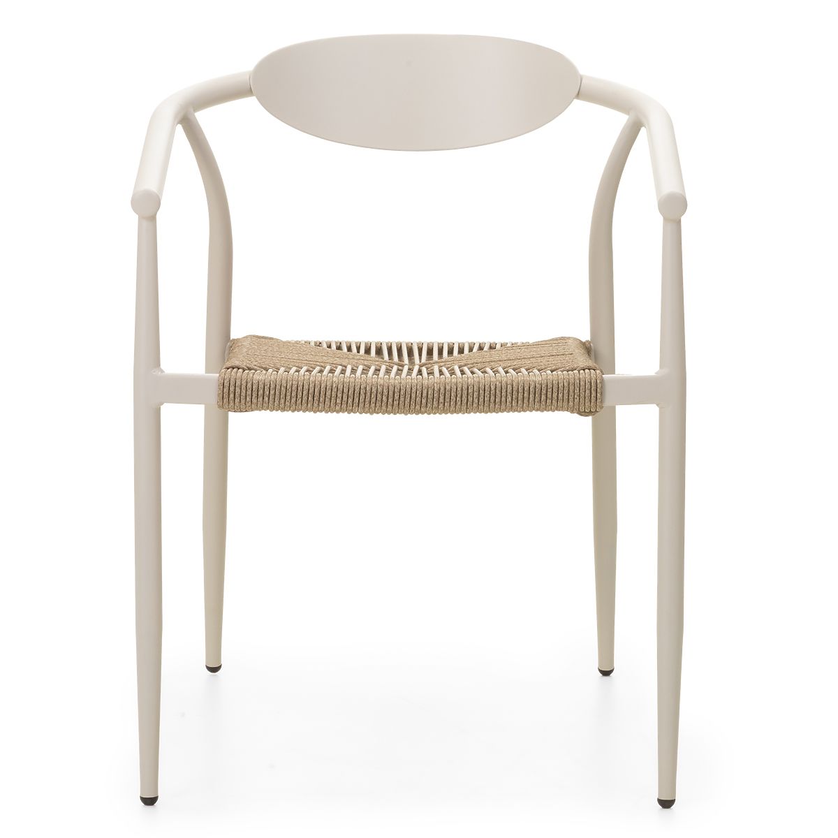 Stackable garden chair with a light beige aluminum frame and technorattan seat. .. more