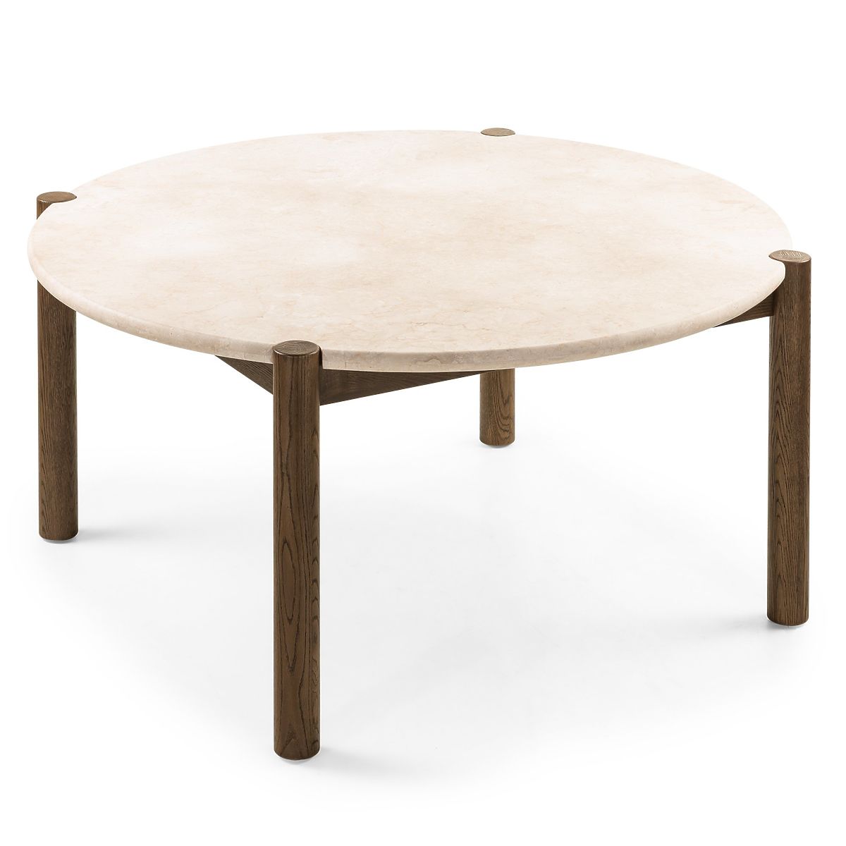Round marble table with mocha oak legs, perfect for any dining room. .. more
