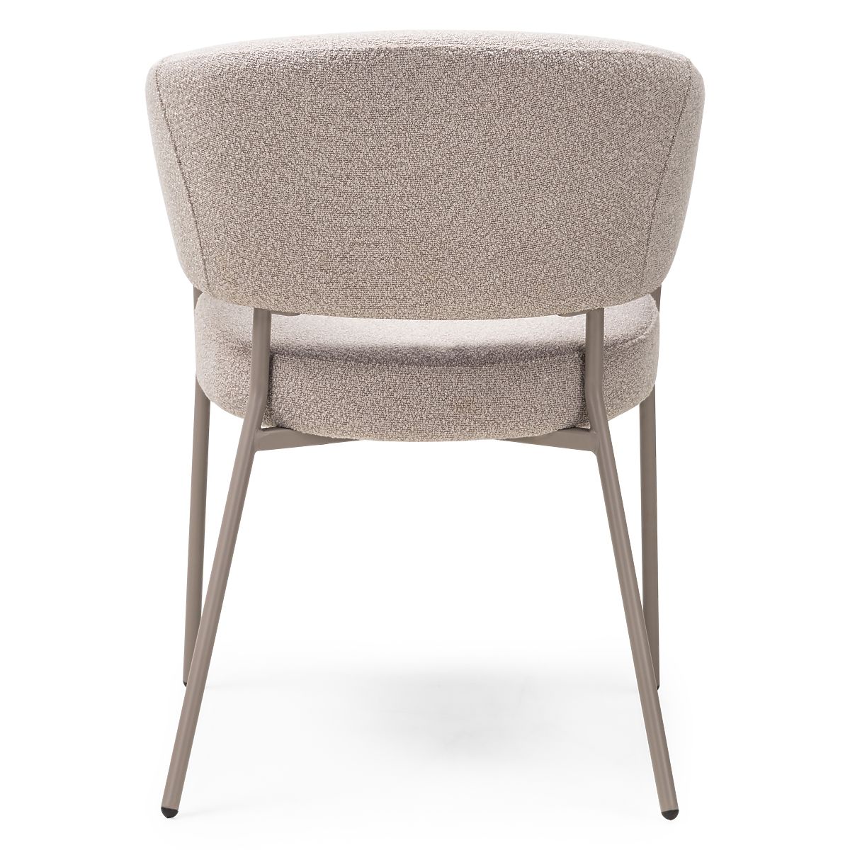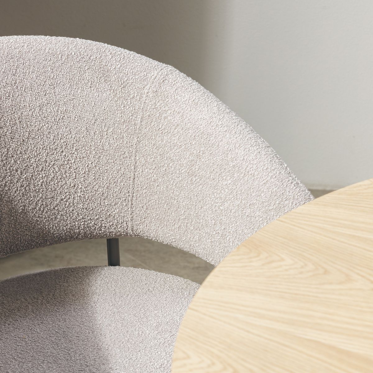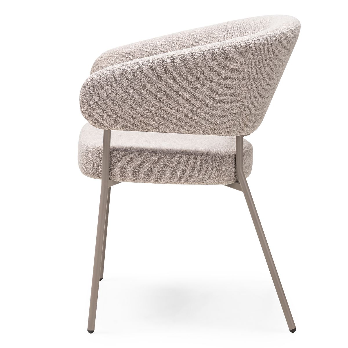 Bouclé fabric chair with beige metal legs and rounded backrest. .. more