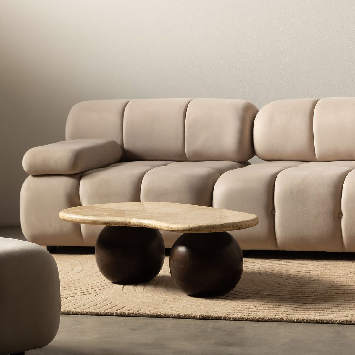 Light beige velvet modular sofa with deep stitching. .. more