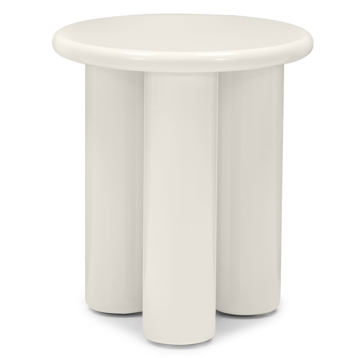 Cream glossy side table with rounded edges and three sturdy legs. .. more