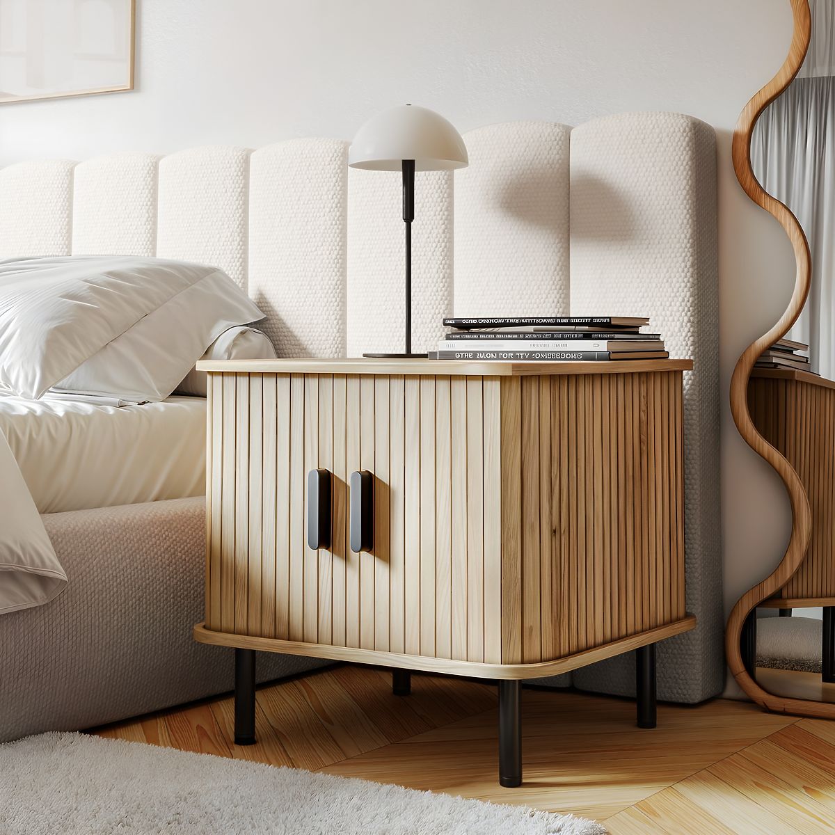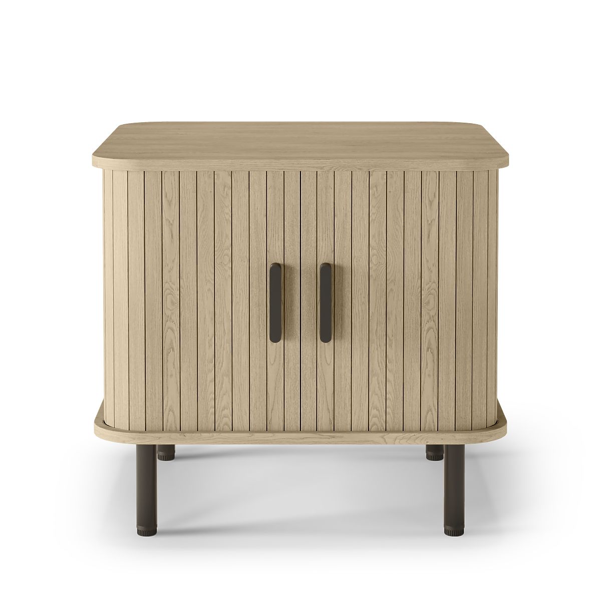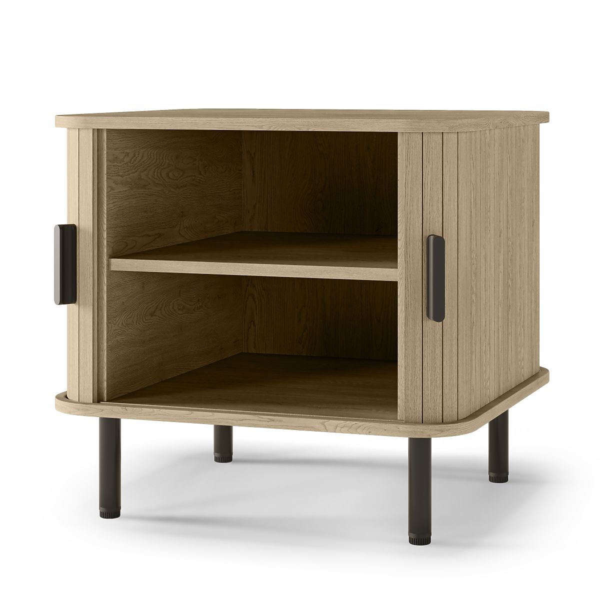 Gliss nightstand with rounded shape and light oak finish. .. more