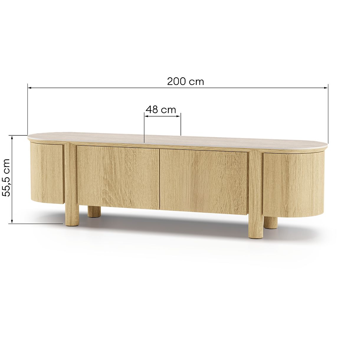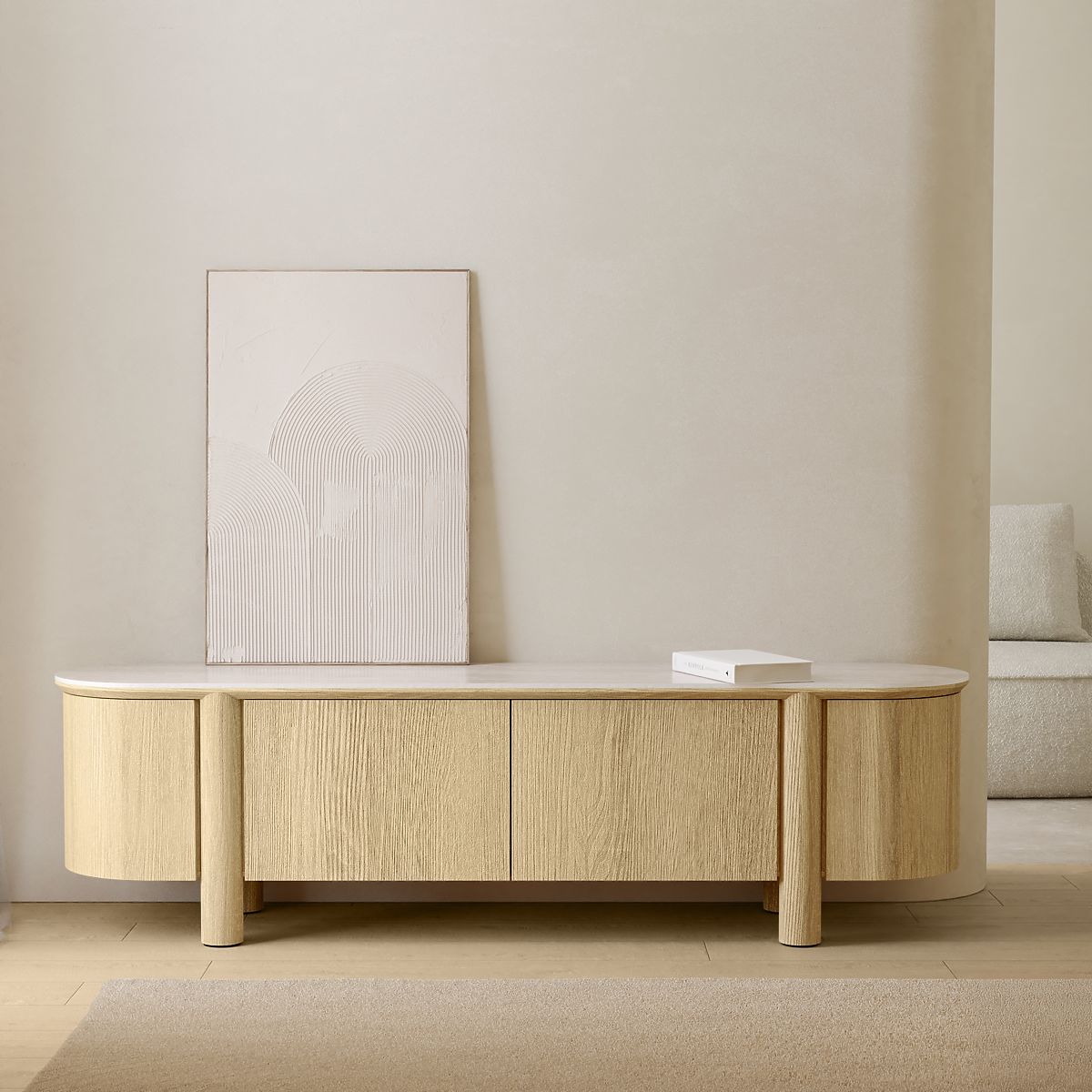 Rounded TV cabinet in natural oak with travertine decor. .. more
