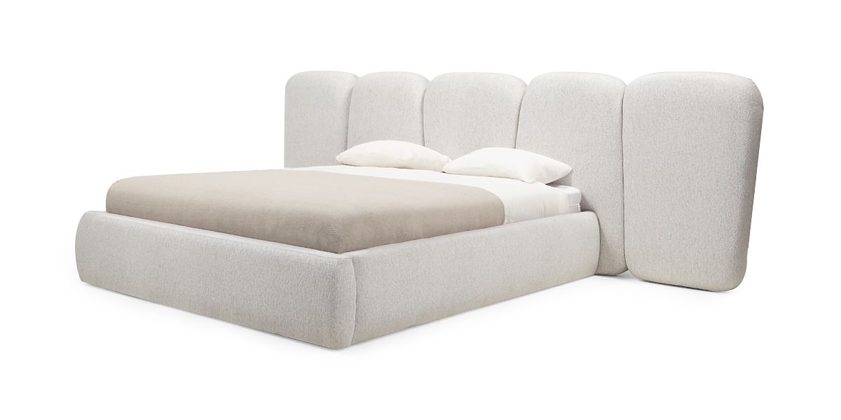Light beige upholstered bed with a wide, rounded headboard. .. more