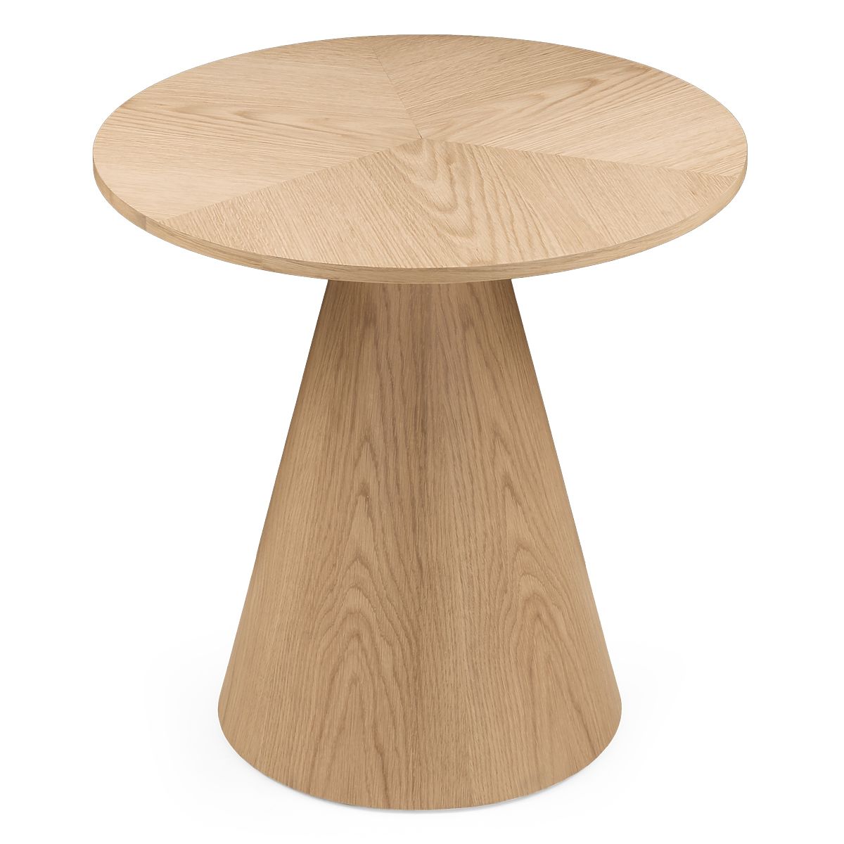 Round oak veneer table with a sturdy cone-shaped base. .. more