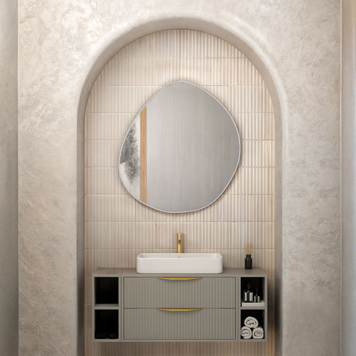 Modern mirror with an irregular shape and silver MDF frame. .. more