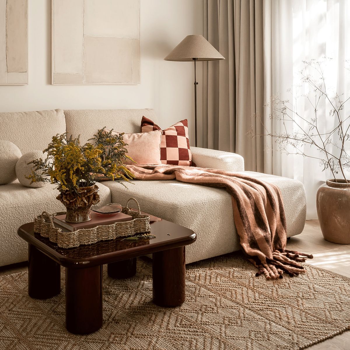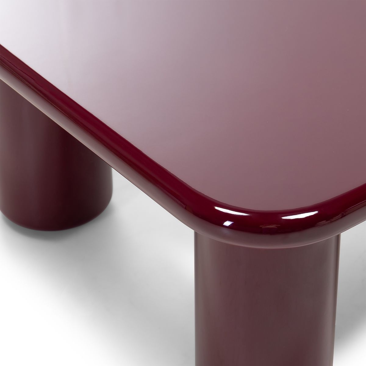 Deep burgundy coffee table with a high-gloss finish and rounded edges. .. more
