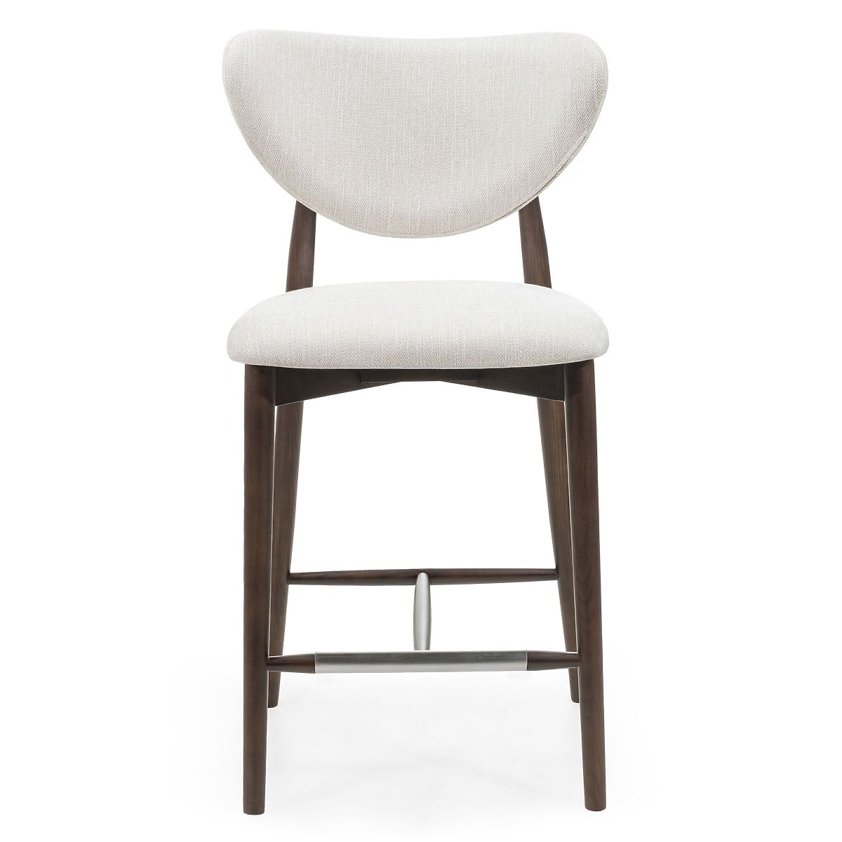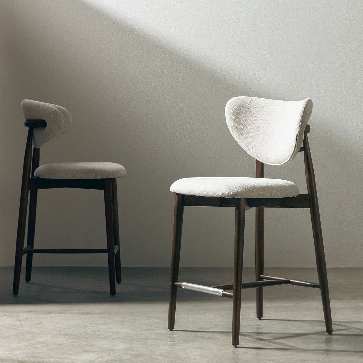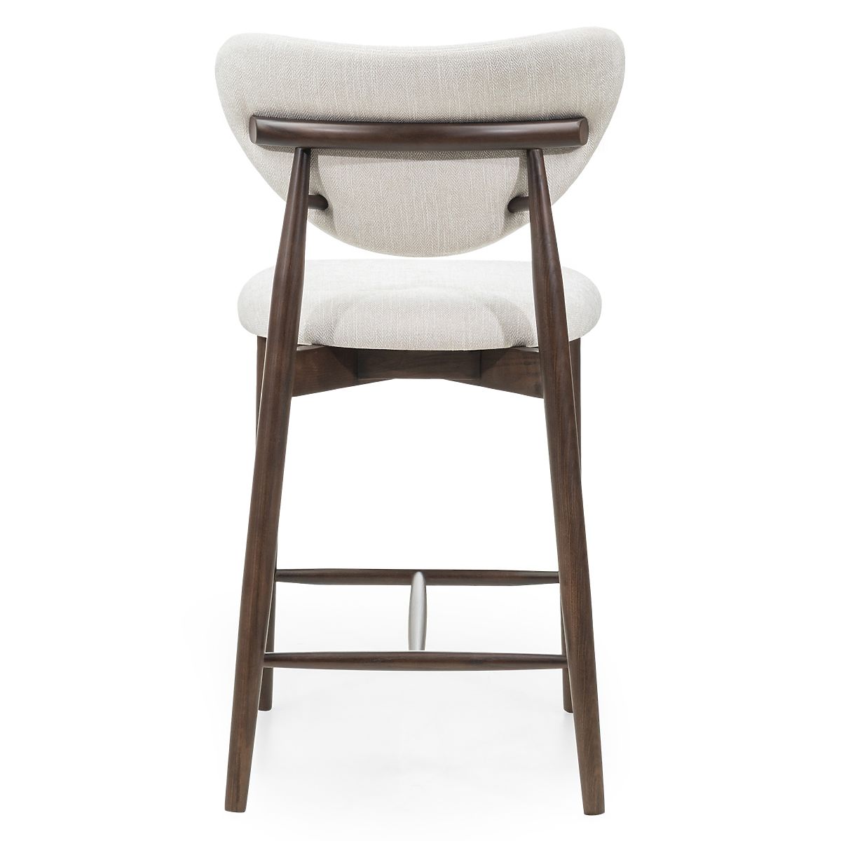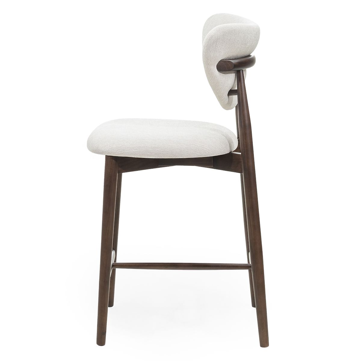 Elegant bar stool with beige upholstery and walnut-stained legs. .. more