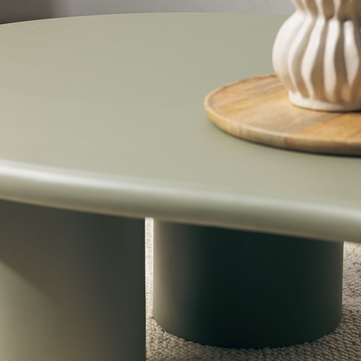 Olive green coffee table with a matte finish and rounded shapes. .. more
