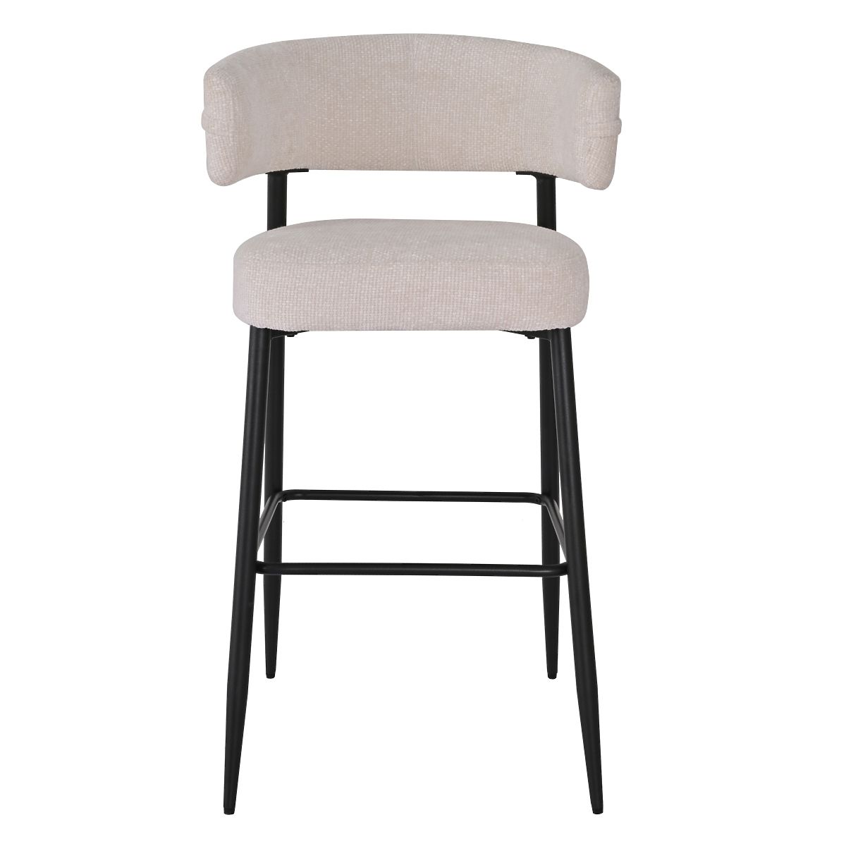 Elegant cream bar stool with black legs and a rounded backrest. .. more