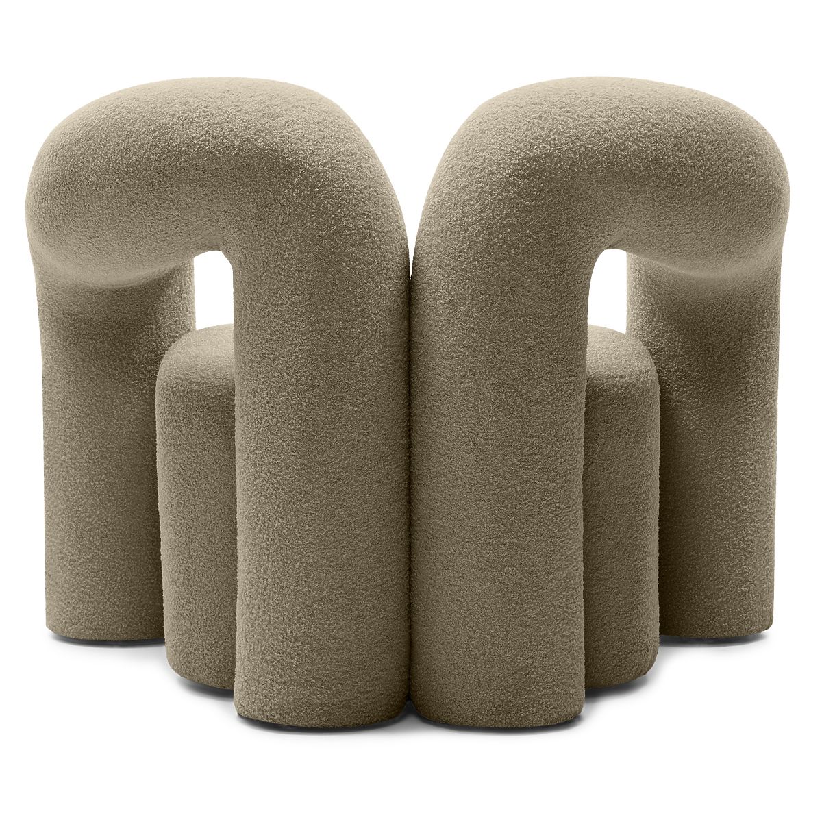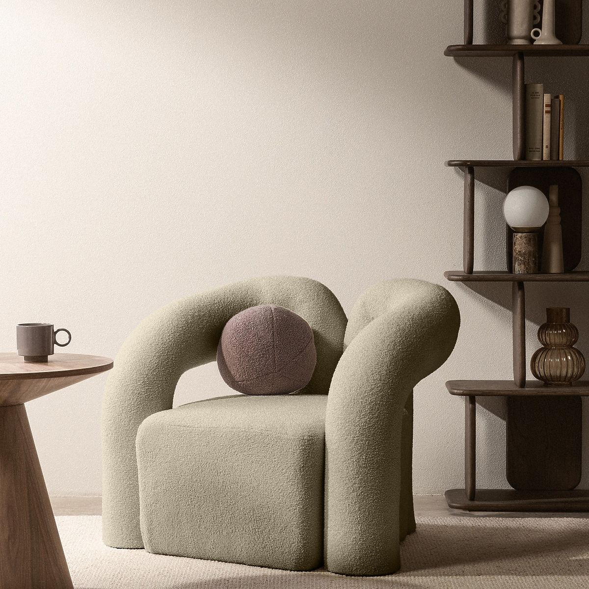 Brown boucle armchair with rounded shapes for comfort and style. .. more