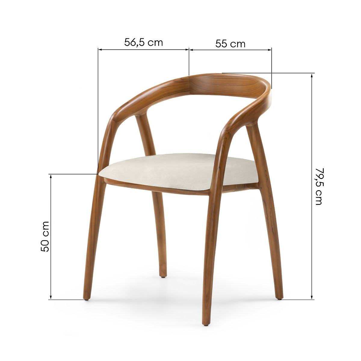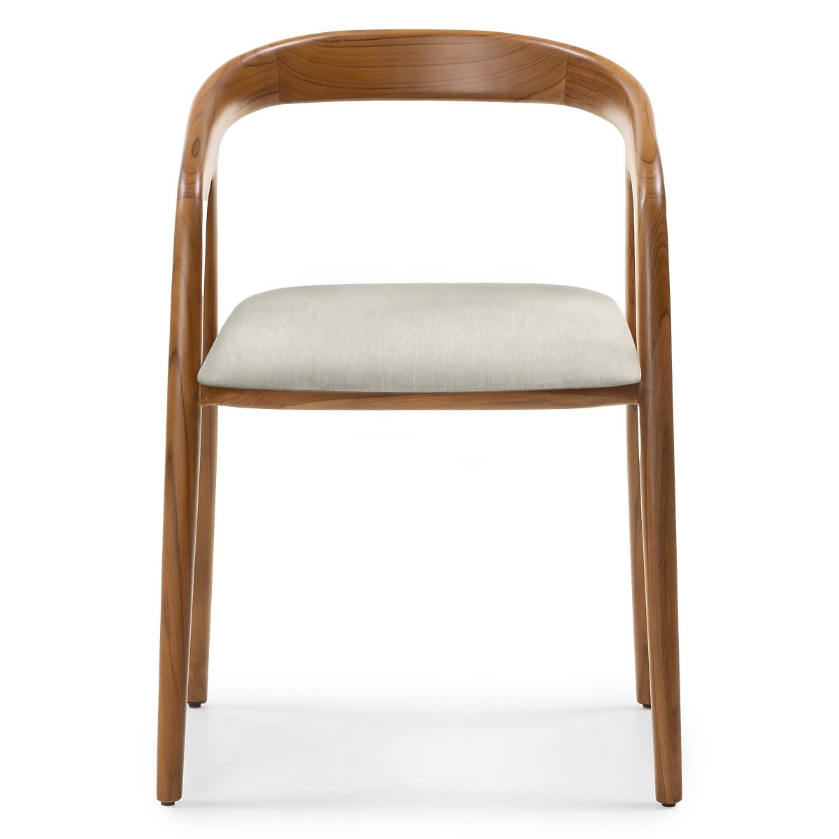 Rounded teak wood chair with cream fabric seat. .. more