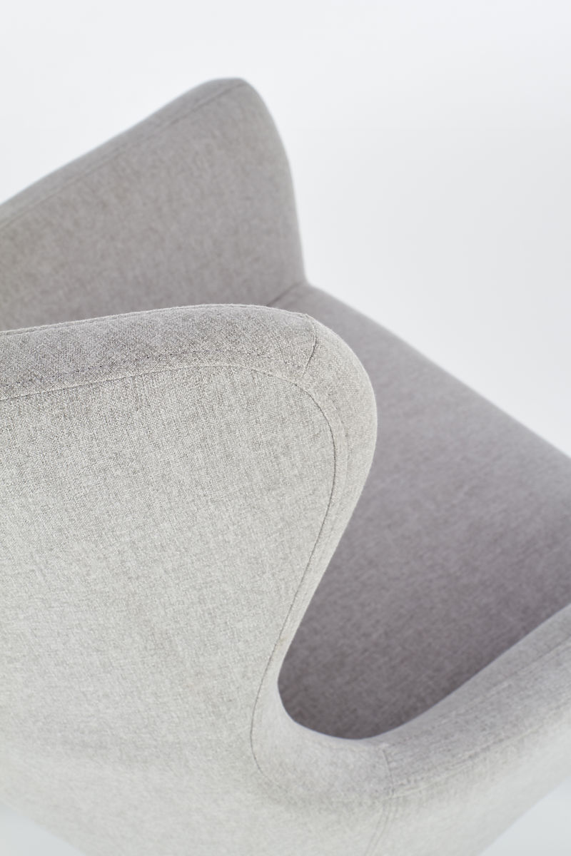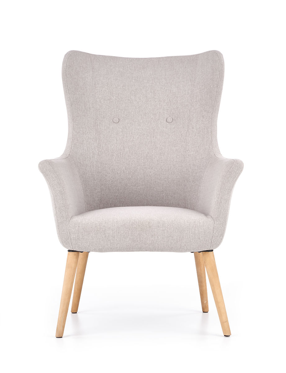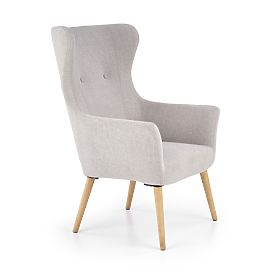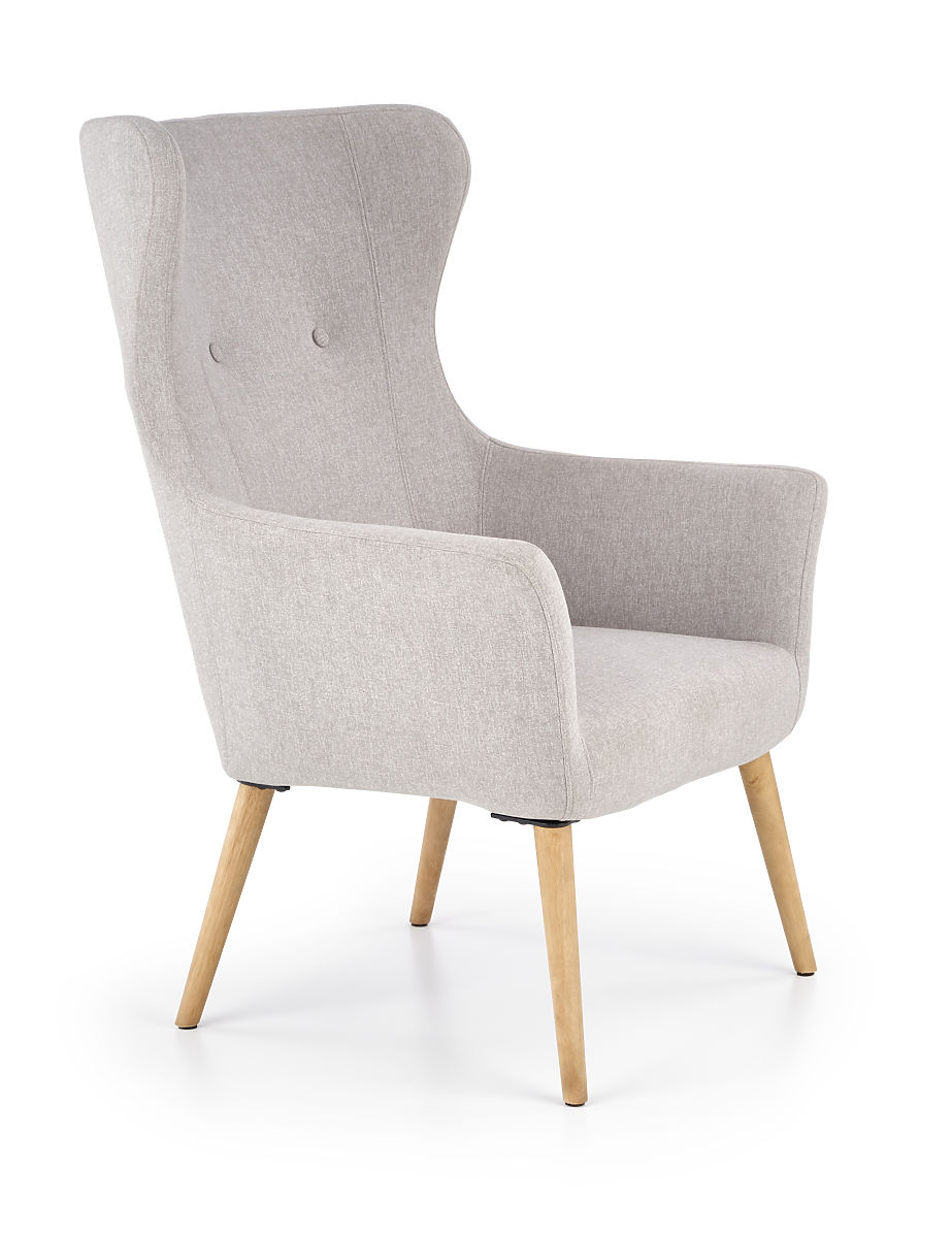 Light gray reclining chair made from fabric and solid rubberwood. .. more