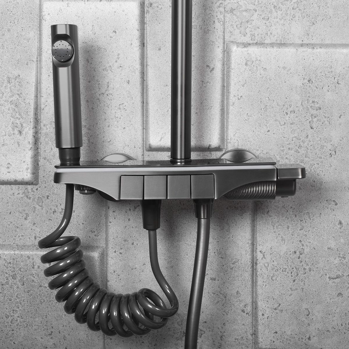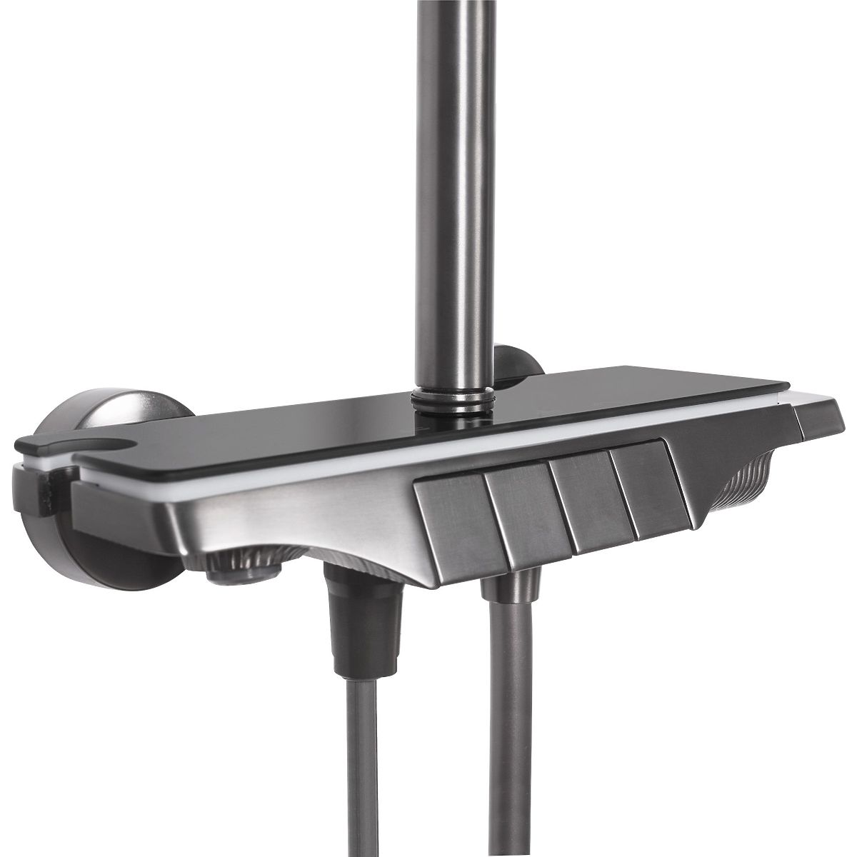 Savio Titan Shower Set The Savio shower set was designed with comfort and functionality in mind. We used top-notch and the best technologies during production to ensure maximum safety and comfort for everyday use. The modern and unique design and high quality of the materials used guarantee long-lasting durability and reliability. The Savio set features a built-in LCD display that provides users with constant access to current water temperature information, allowing for quick and precise adjustment to individual preferences (the display does not require connection to the power grid). The faucet has blue LED backlighting. The spout in the shower set is fixed. The presented shower set does not have water pressure regulation.