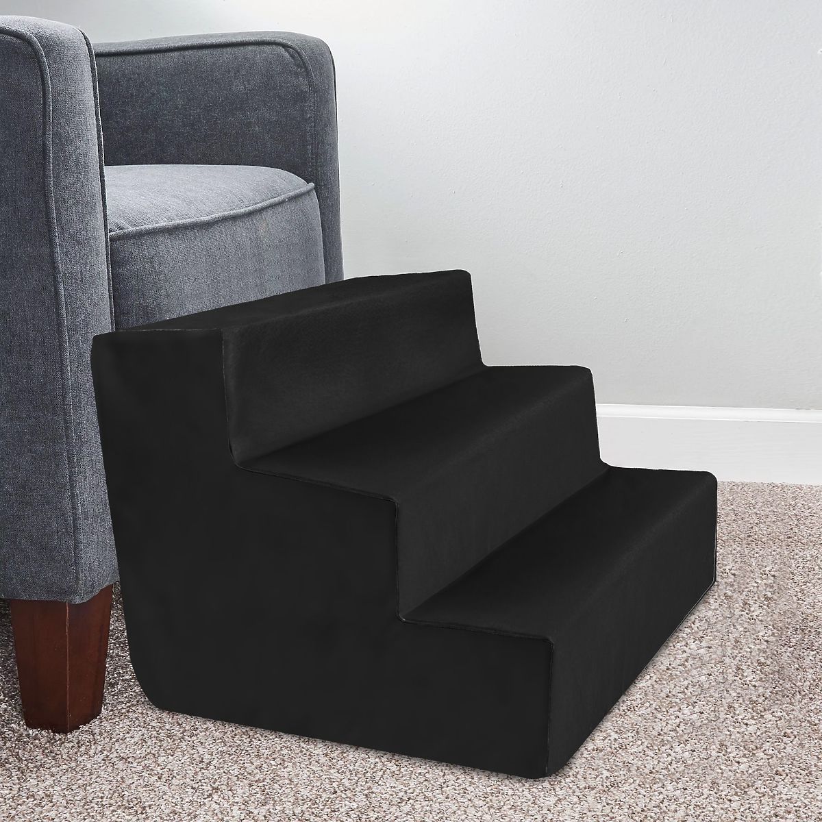 Pet stairs are a practical and convenient solution for your pet. With three stable steps, they allow easy and safe climbing onto a sofa, bed, or other elevated surfaces. Made from durable materials, they are lightweight yet sturdy, providing comfort for both small dogs and cats. The classic black design fits perfectly into any interior. The cover can be easily removed and cleaned, making it easy to keep the product clean.