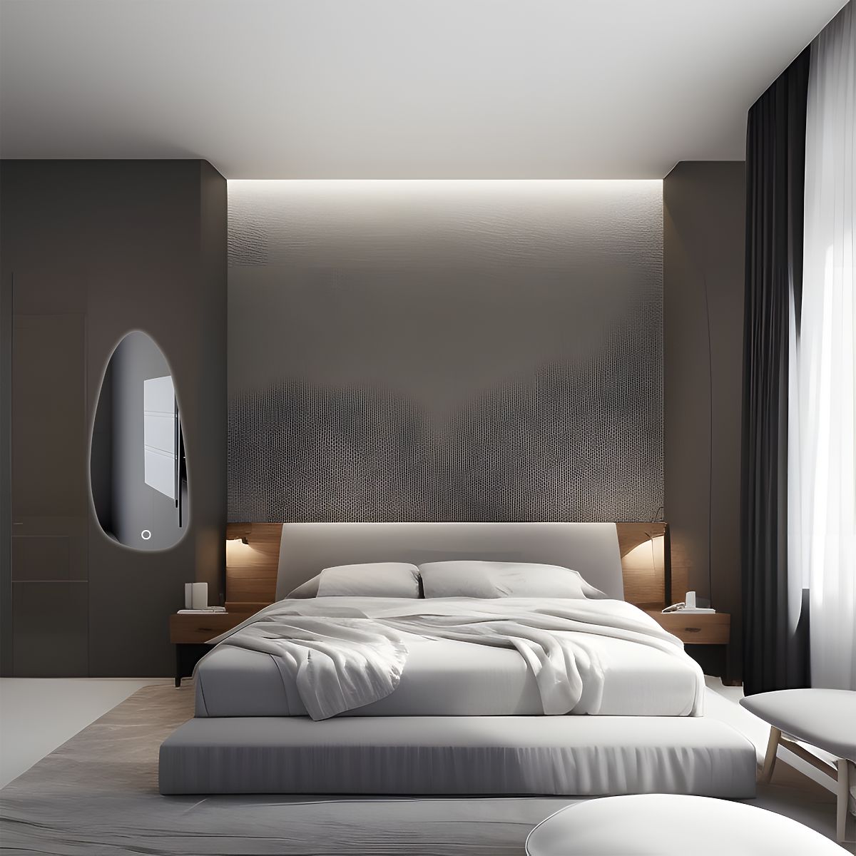 The longitudinal LED mirror with an irregular, organic shape is an excellent choice for those who value modern design and high-quality craftsmanship. The subtle, neutral LED lighting provides excellent conditions for daily care and creates a pleasant atmosphere in the bathroom. The built-in touch switch, which is backlit blue when the function is active and red when the lighting is off, ensures intuitive operation and an elegant visual effect. A white power cable with a length of 105 cm makes installation easy.