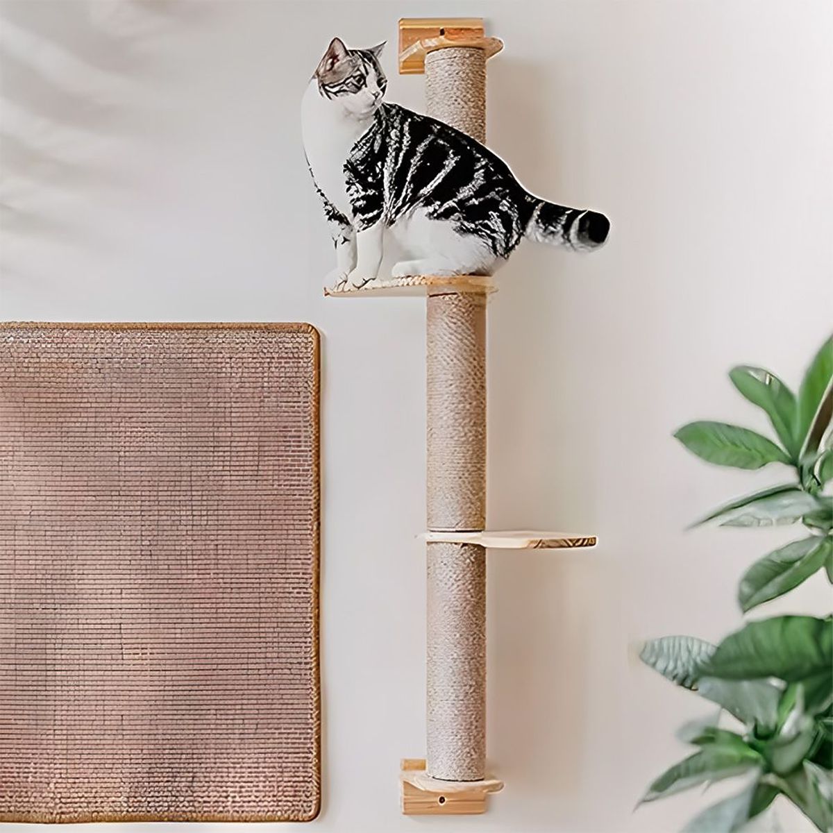 Give your cat the perfect place to climb, scratch, and observe the surroundings! Our wall-mounted scratcher is a practical and stylish solution that fits perfectly into any interior—it doesn't take up floor space while offering your pet plenty of attractions. The wall-mounted scratcher features a sturdy post wrapped in sisal, which is an ideal spot for scratching. Two stable wooden shelves allow your cat to climb and rest at different levels. It's the perfect solution for active and curious cats.