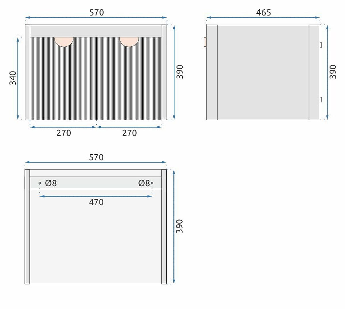 The cabinet with a mirror is equipped with open shelves that ensure quick access to daily cosmetics. The lower cabinet accommodates larger items, such as cleaning agents or bottled cosmetics. The whole is wall-mounted, which not only visually enlarges the space but also makes it easier to maintain cleanliness around the furniture. Sink adapted to the whole