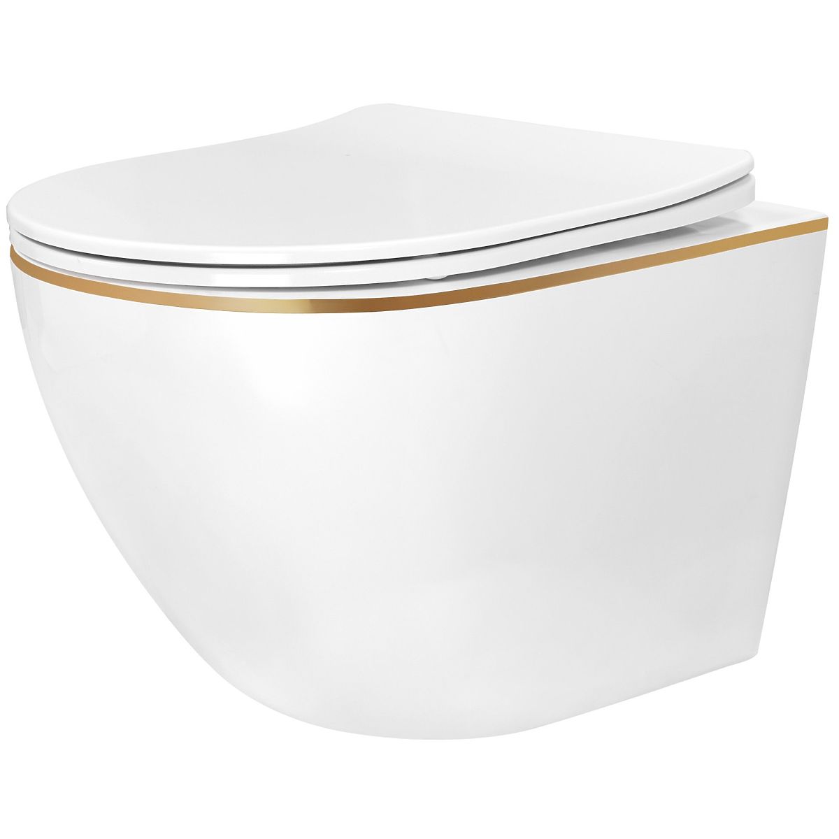 The wall-hung toilet bowl without a rim, white with a gold edge and an innovative Tornado Nfq (Noise-Free Quiet) flushing system, is a modern solution that combines elegance, easy maintenance, and flushing efficiency. The rimless design not only adds modernity but also makes it easier to maintain cleanliness around the bowl. Designed with savings and ecology in mind, the bowl uses a minimal amount of water without sacrificing high flushing efficiency. The bowl is compatible with most Geberit, Grohe, Sanit, Rea concealed systems.