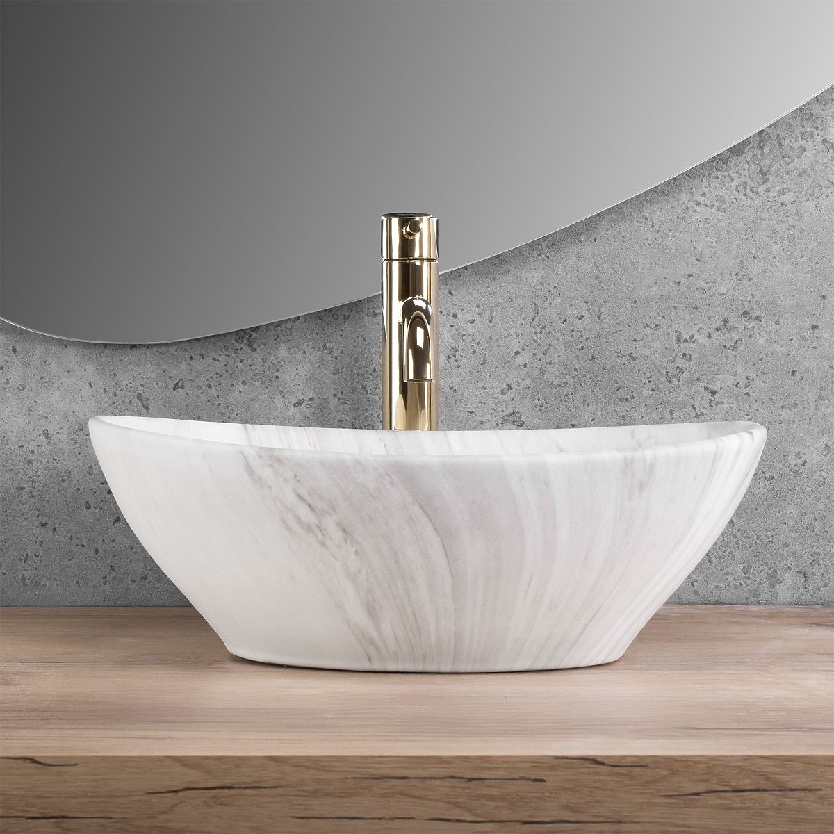 We present to you the new model of the highly popular Sofia washbasin in our range. The washbasin is made from the highest quality sanitary ceramic, which is very durable and easy to clean. It is specially styled in a stone design, contributing to an amazing effect in any bathroom. The washbasin is adapted for installation on a countertop or cabinet. It perfectly matches any color of the surface on which it will be mounted.