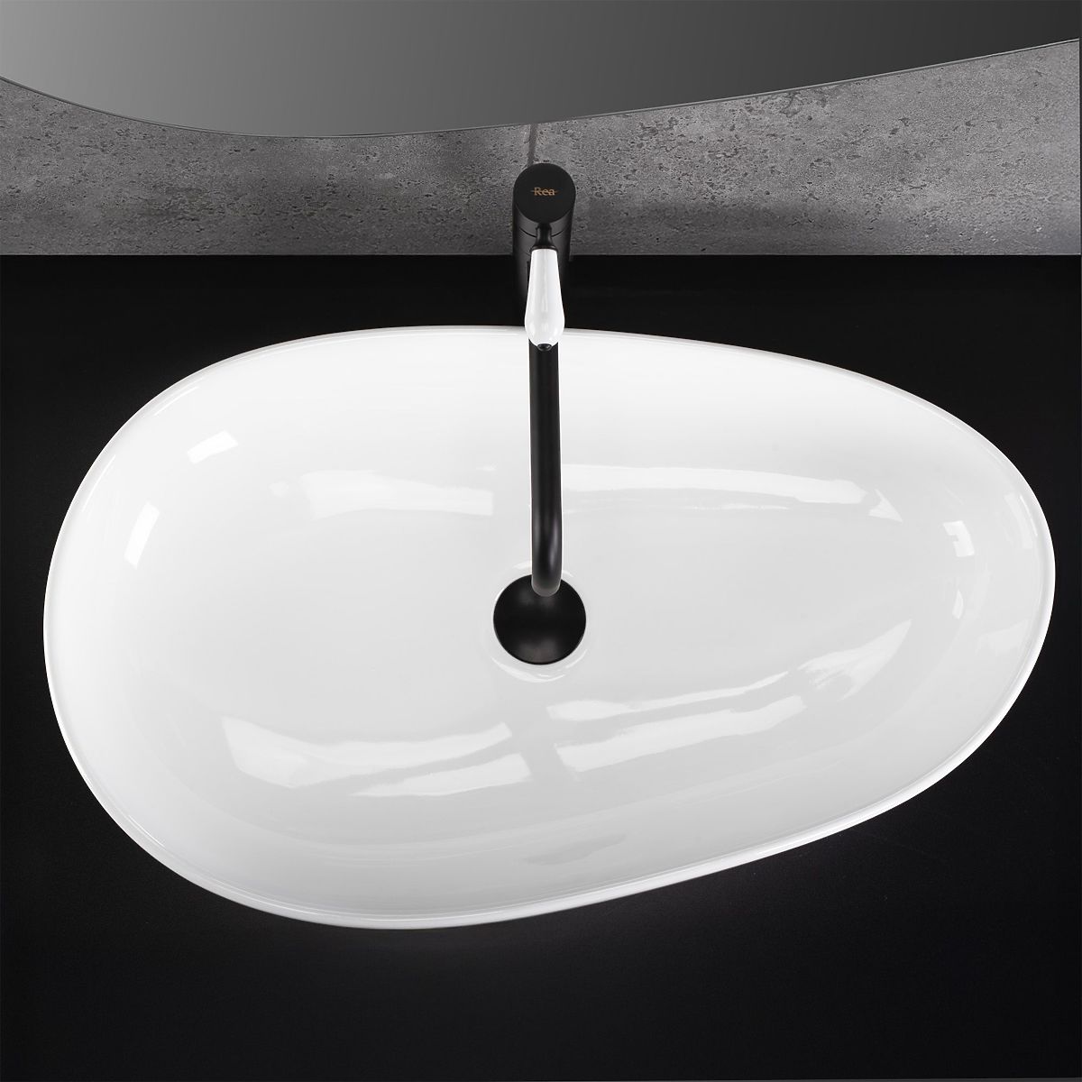 Sandra is a washbasin that is mounted directly on the countertop, allowing for space-saving bathroom organization. Its interesting shape, resembling an irregular teardrop, adds a subtle yet exceptional accent to the bathroom.