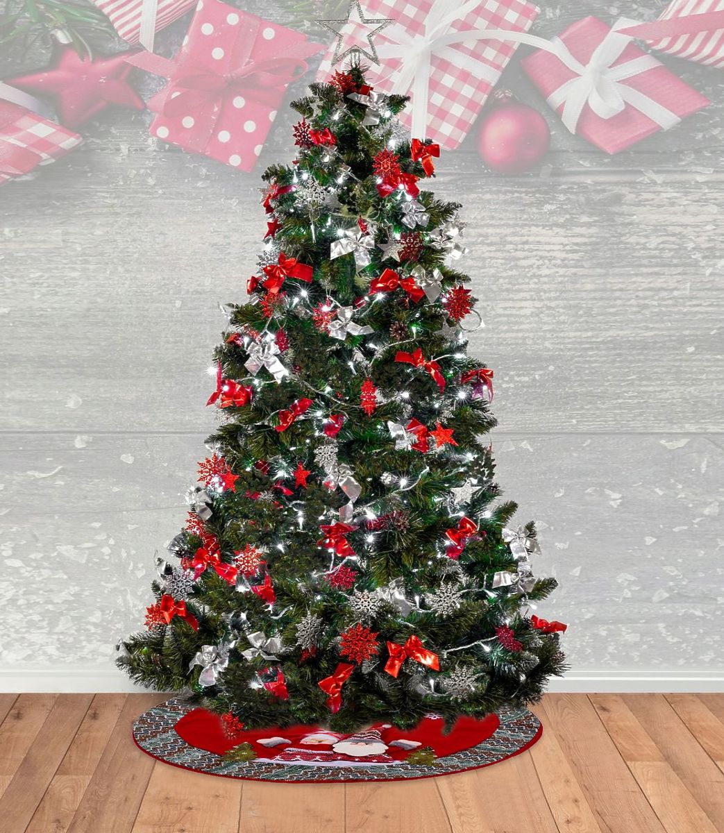 We present to you an exceptionally stylish red tree skirt. It is perfect for both real and artificial trees. Besides its obvious aesthetic value, it helps maintain cleanliness under a real tree. Simply shake off the fallen needles and place the decoration back under the tree.