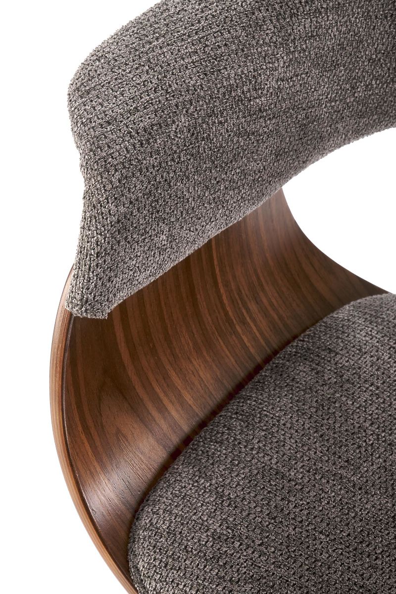 Gray and walnut chair made of bent plywood and fabric. .. more