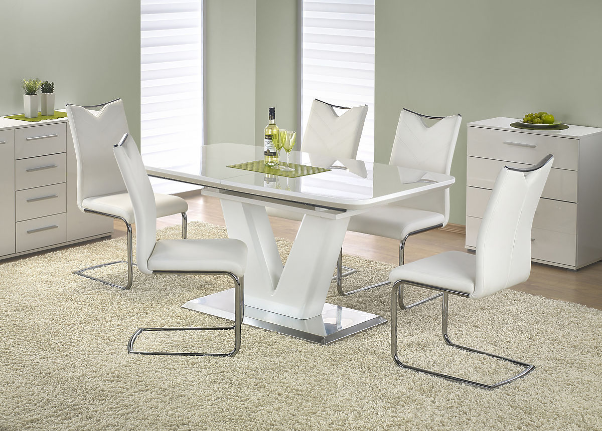 The neutral, elegant white color and modern shape allow easy matching with dining chairs from our offer and complement any interior. The table's extending mechanism allows for lengthening, comfortably accommodating more guests.