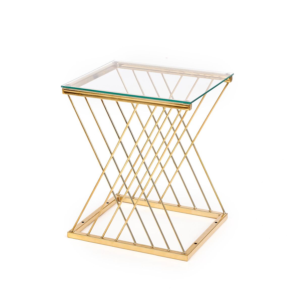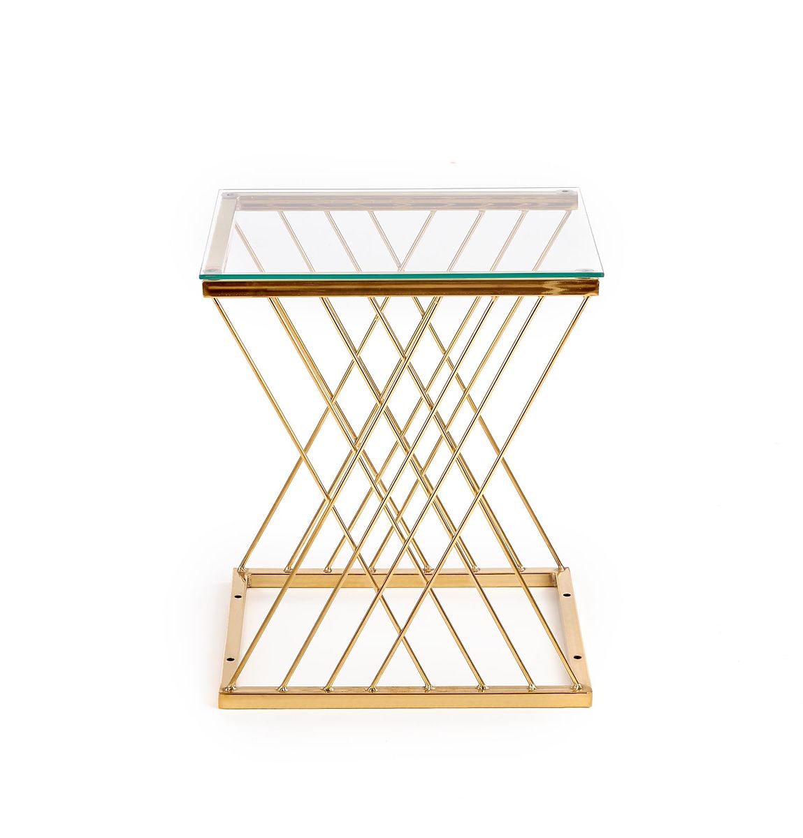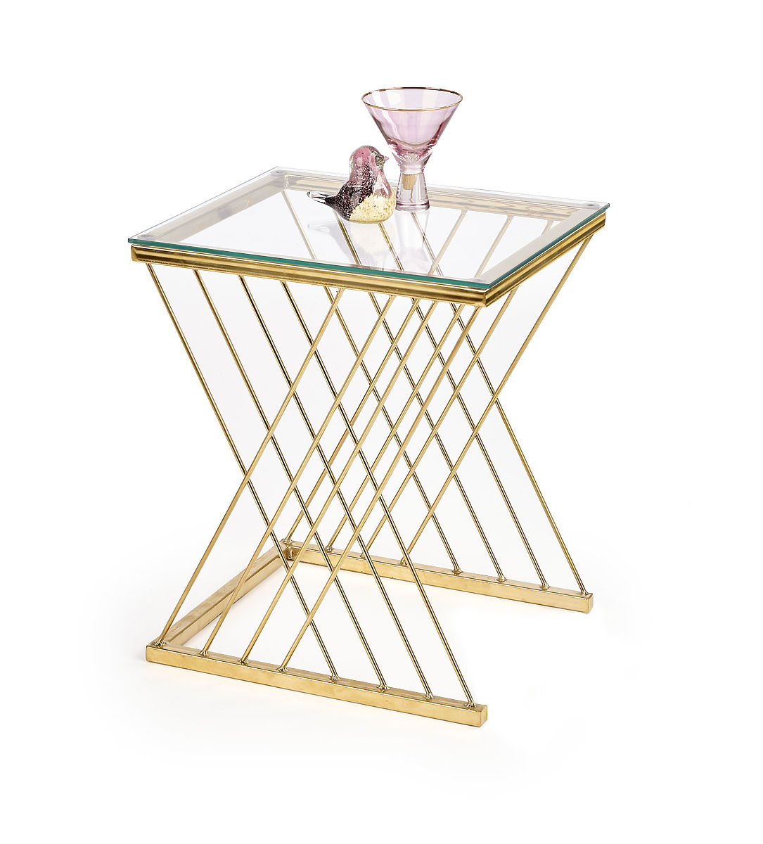 Gold and transparent table made of glass and chrome-plated steel. .. more