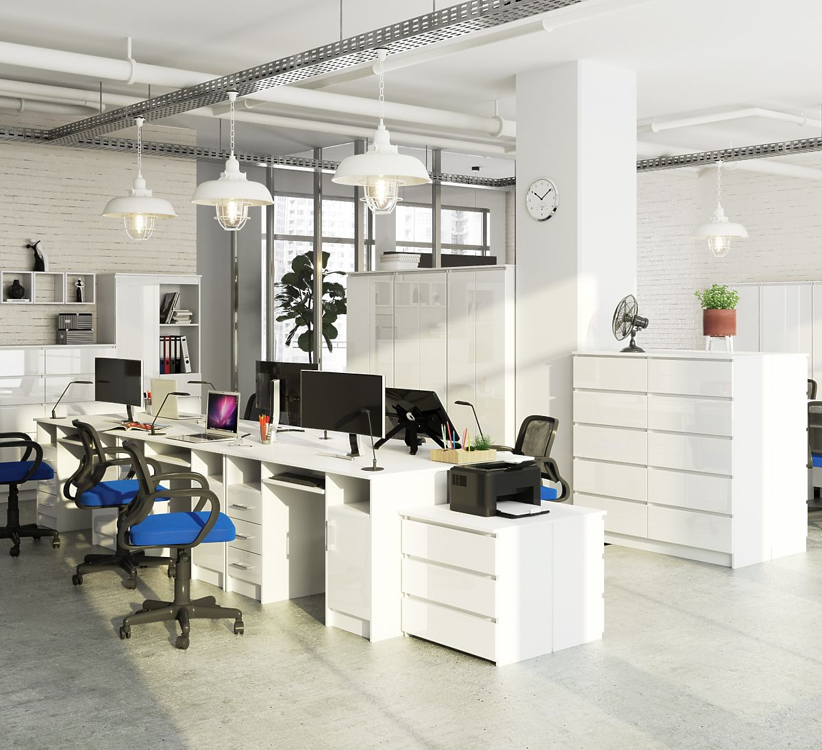 The presented desk is characterized by a simple form and elegant appearance - perfect for those who value functional and aesthetic solutions. The furniture is made of high-quality 16 mm laminated board, which is highly resistant to abrasion. Its edges are lined with ABS edging, which increases their resistance to damage. An interesting feature is that the drawer and door fronts are made of high-gloss MDF board - it features the highest possible gloss standard. The furniture is white with silver handles. The desk includes three drawers, two open shelves, and one shelf with a door, providing plenty of space for use. This allows for good work organization, as important accessories and equipment can be kept within reach. The desk dimensions are 124 cm in length, 74 cm in height, and 52 cm in depth. The furniture is intended for self-assembly, with instructions included. The desk is great for both work environments and home.