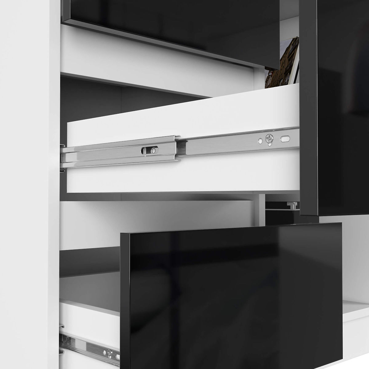 The furniture body is in matte white, while the drawer fronts are black with a high gloss achieved through acrylic technology offering the highest gloss standard on the market. The desk is made from high-quality 16mm laminated board produced by Kronospan. The board edges are finished with modern ABS edging. The furniture is resistant to abrasion and mechanical damage from everyday use. The drawers glide on high-quality metal ball-bearing slides.