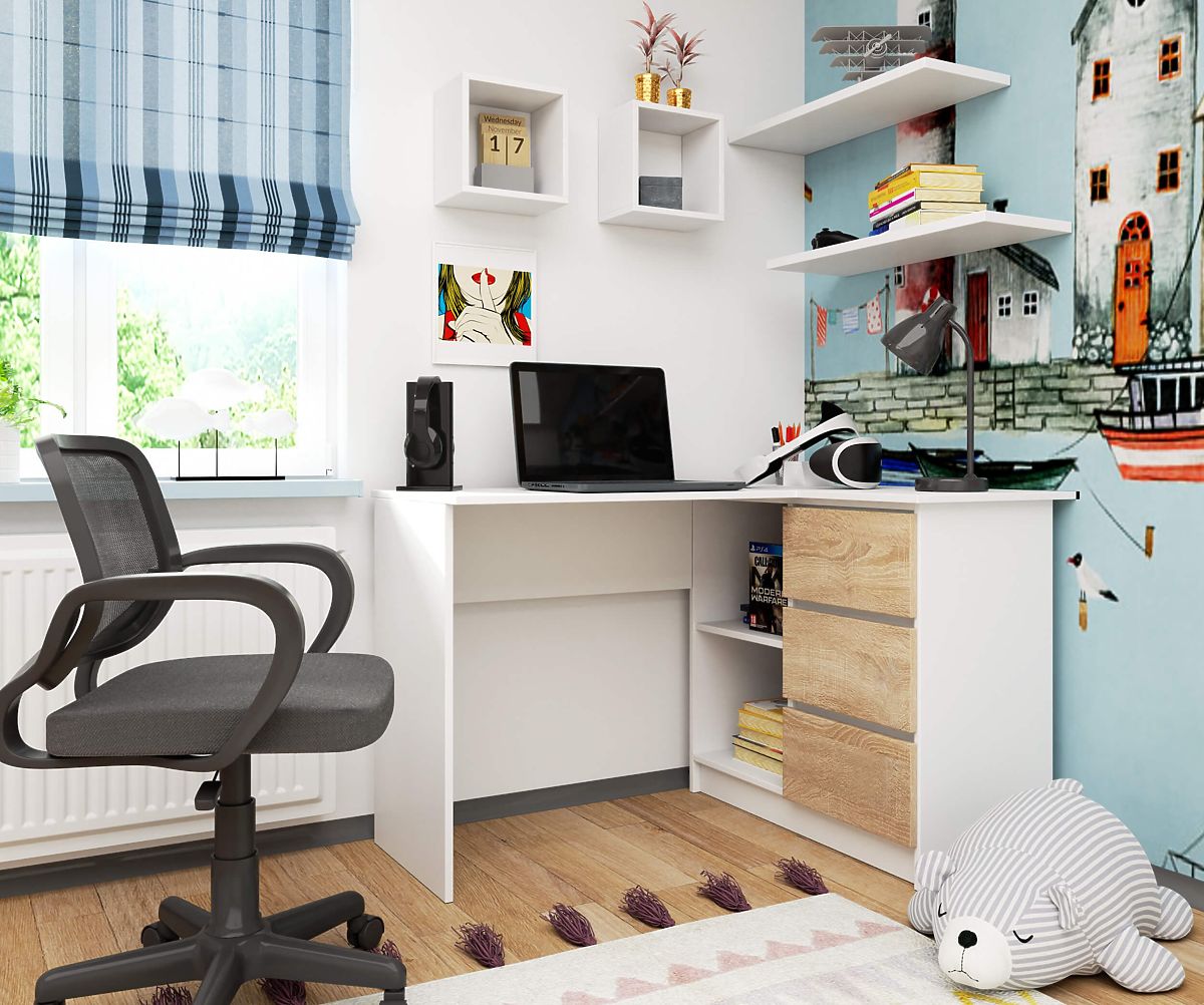 The corner desk is an interesting choice for both living spaces and corporate offices. It takes up little space and allows for the storage of all necessary office supplies. It also provides space for work or study, making it an ideal computer workstation. The white corner desk with three drawers featuring Sonoma oak fronts is a modern offering aimed at young people who pay attention to every detail. The solid construction ensures durability, and the high-quality materials used in production, such as the 16-millimeter-thick laminated board, guarantee resistance to damage. This attractively priced product charms with its quality and design. We also recommend exploring other offers from this collection, such as dressers, wardrobes, shelves, and many more. With them, you can create an efficient and practical office space both at home and in the company. We invite you to explore our offer.