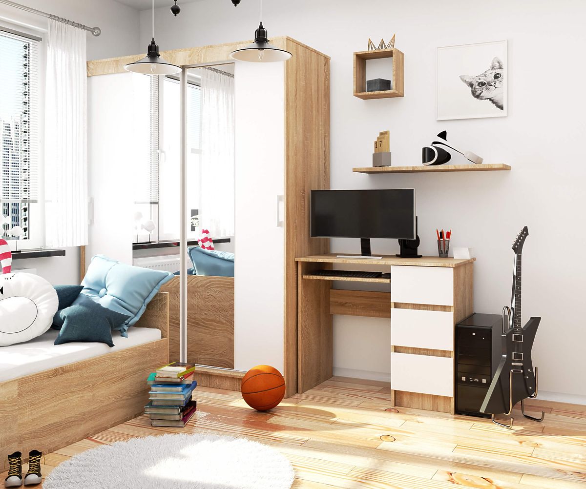 The desk is a piece of furniture that should not be missing in any living room or youth room. It is practical, takes up little space, and can be used for work, study, or entertainment. It is also perfect for home offices and office spaces. In our offer, you will find many interesting desks designed functionally and modernly. One option is the A-6 computer desk (right), which will meet the expectations of even the most demanding customers. It is a high-quality product that shows great resistance to damage and potential scratches. Thanks to this, it can be used in rooms with high traffic. The desk includes three exceptionally spacious drawers and a pull-out shelf on roller guides. Overall, it is maintained in two fashionable and timeless colors, which are sonoma oak and white.