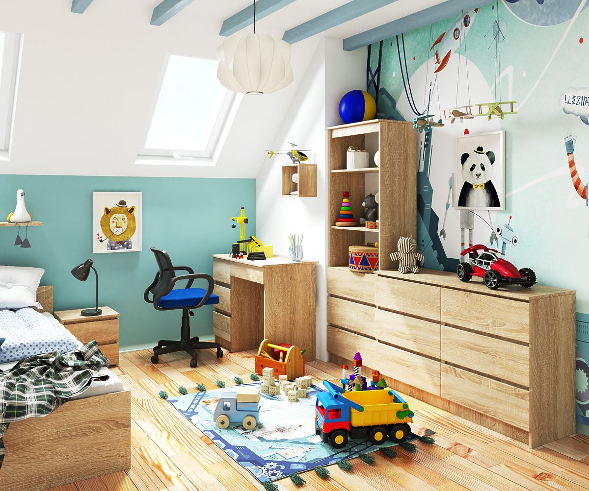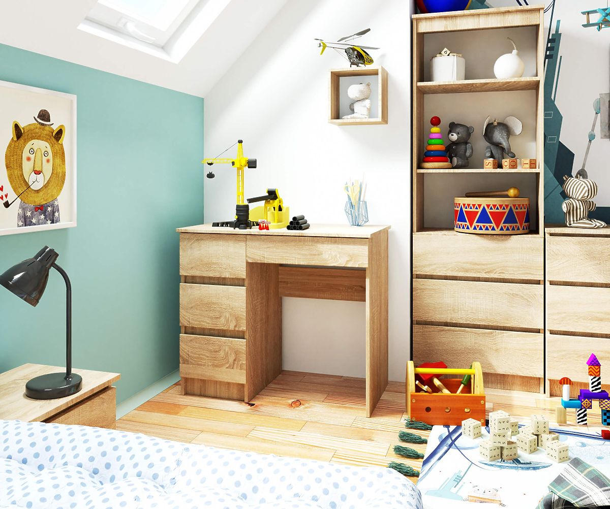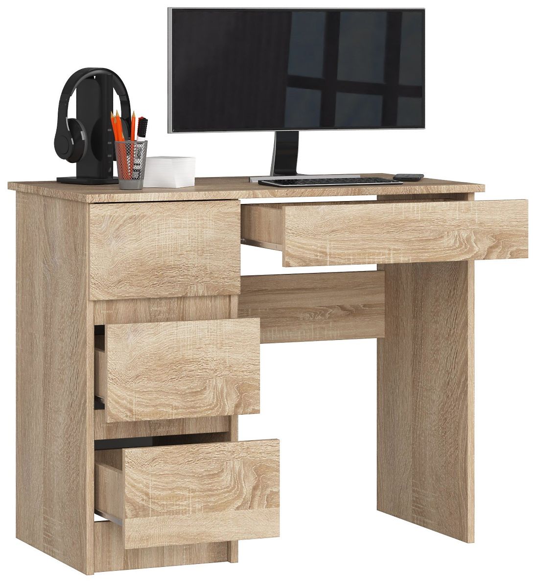 Left-sided computer desk in Sonoma oak color with four spacious drawers. Perfectly suited for a child's or student's room, as well as an office or study. The desk is part of the CLP furniture system, designed to match other furniture from this series. This allows you to furnish a room with various furniture pieces, such as shelves or dressers, that will match in shape and color. It has a modern line, and the handle-free drawers add a minimalist charm to the furniture. It offers plenty of storage space with its four drawers. Thanks to its classic appearance, the desk has a universal character and never goes out of style. The desk's construction allows for comfortable and ergonomic computer use.